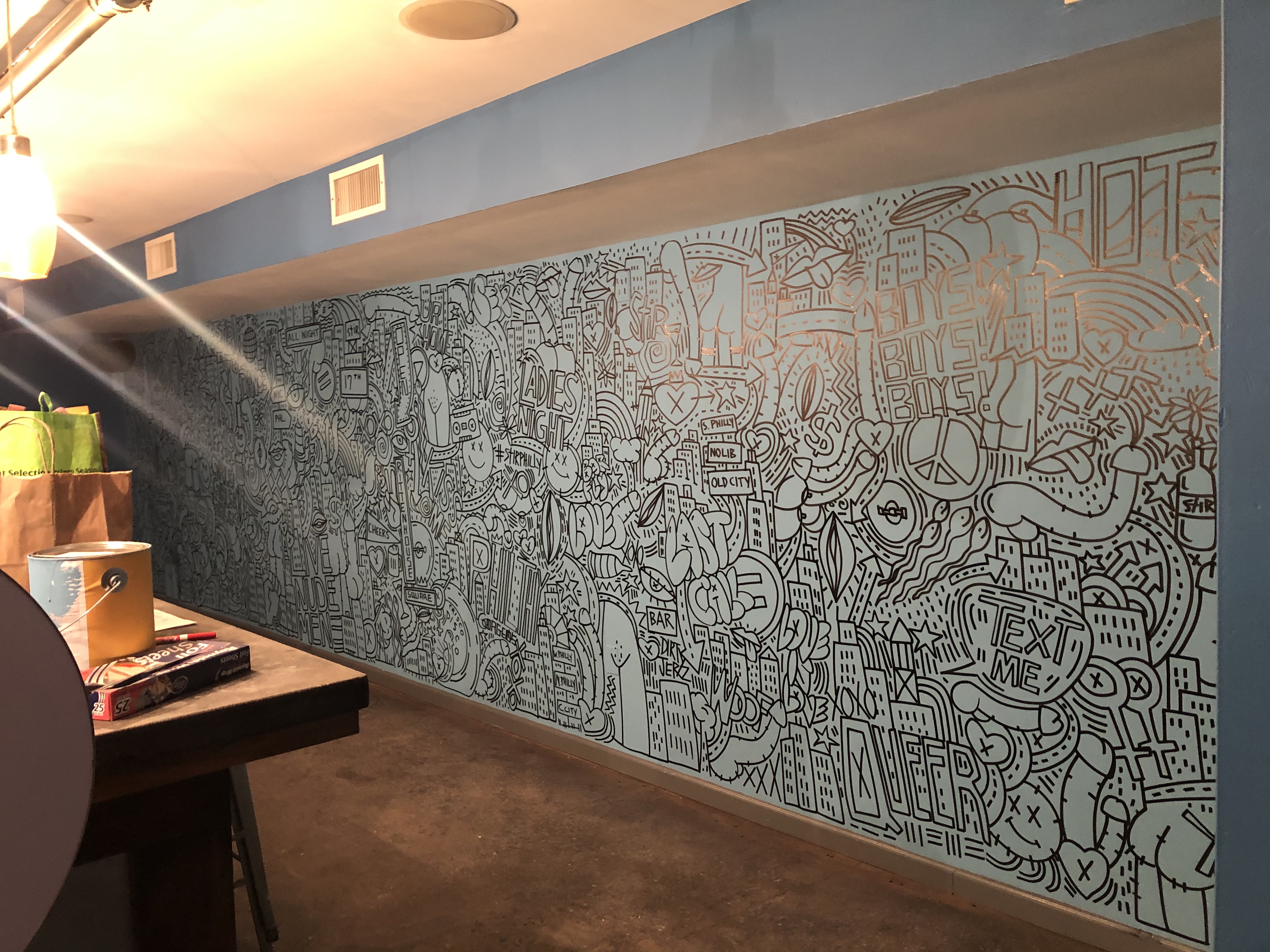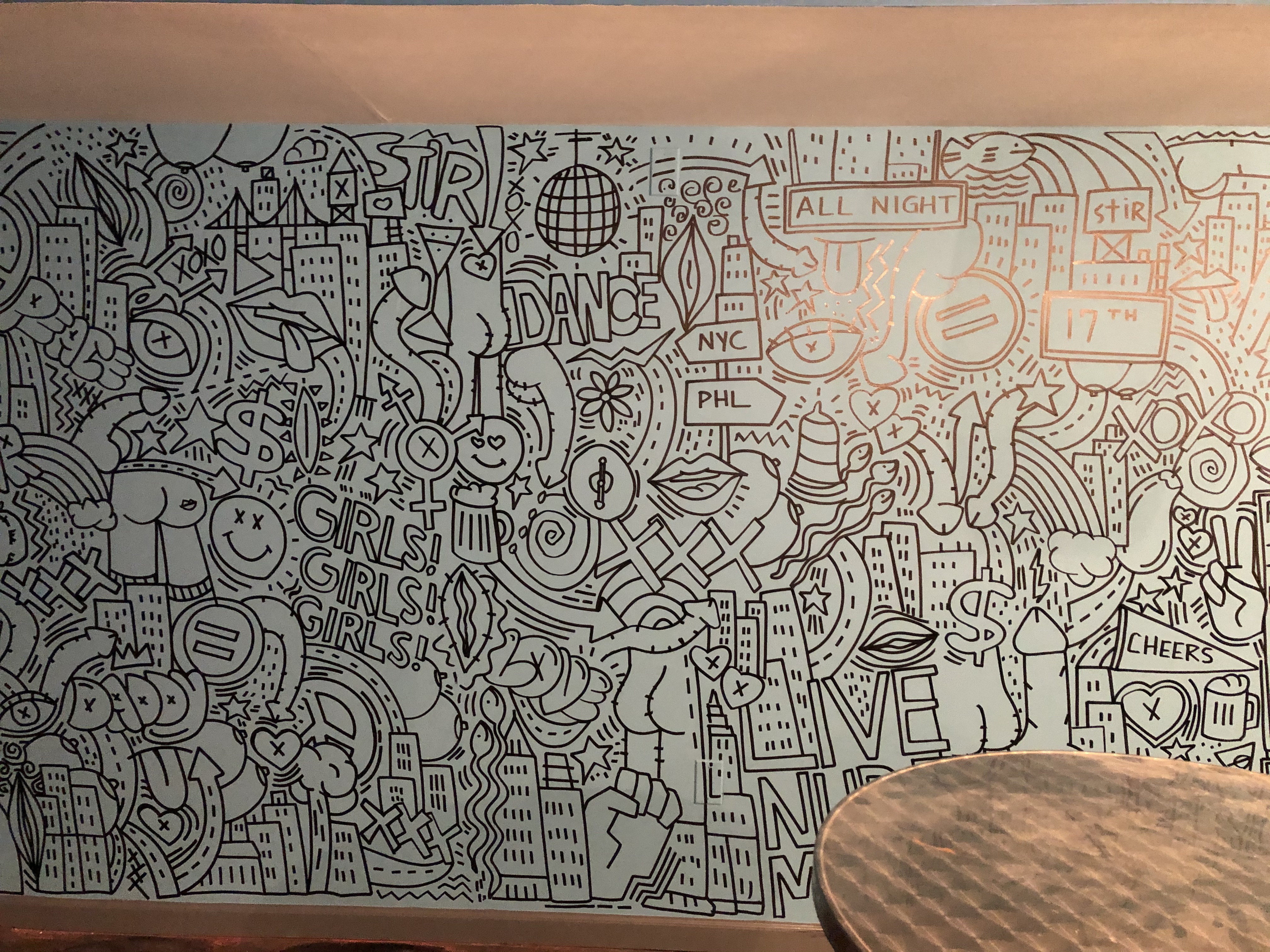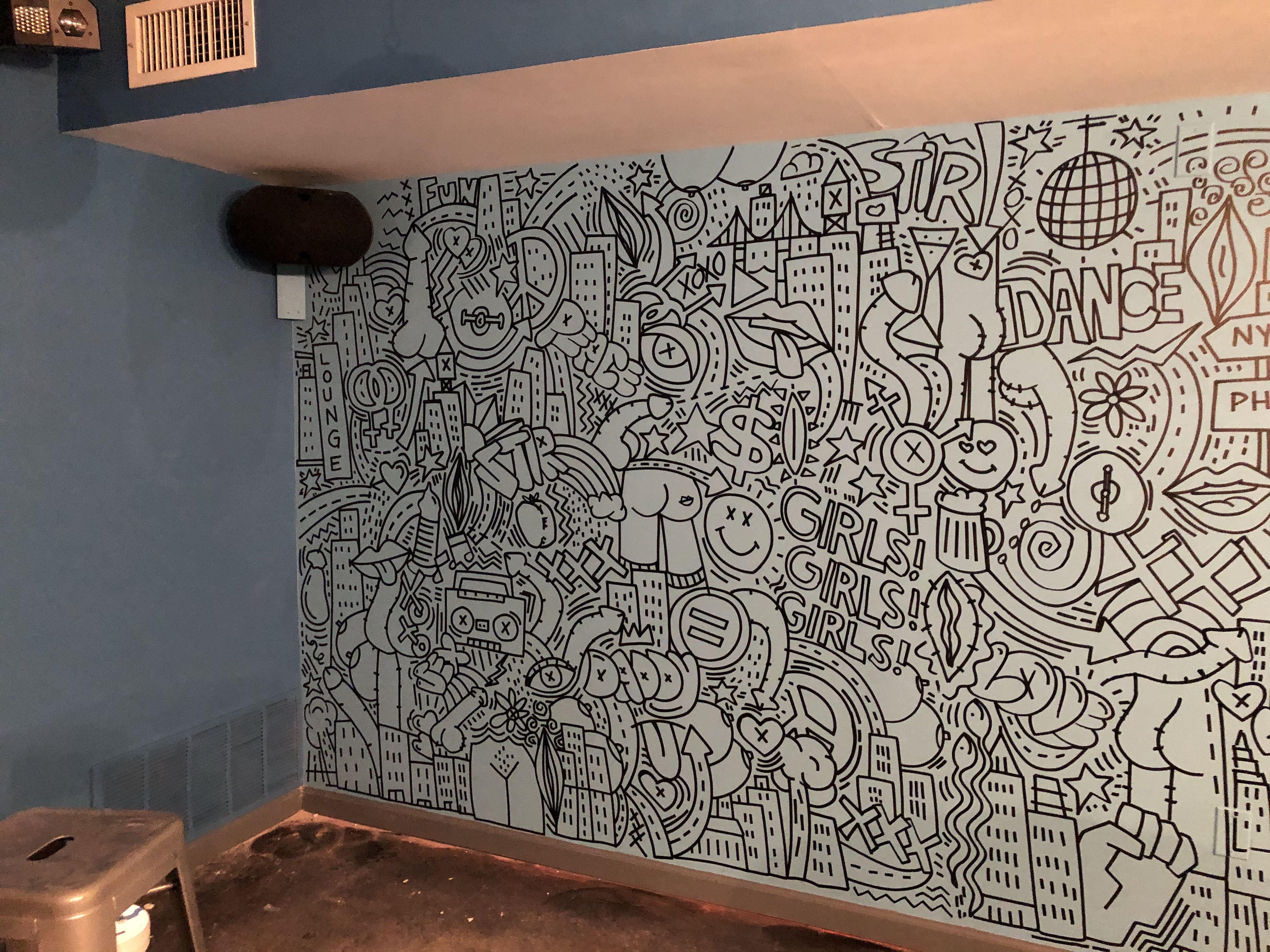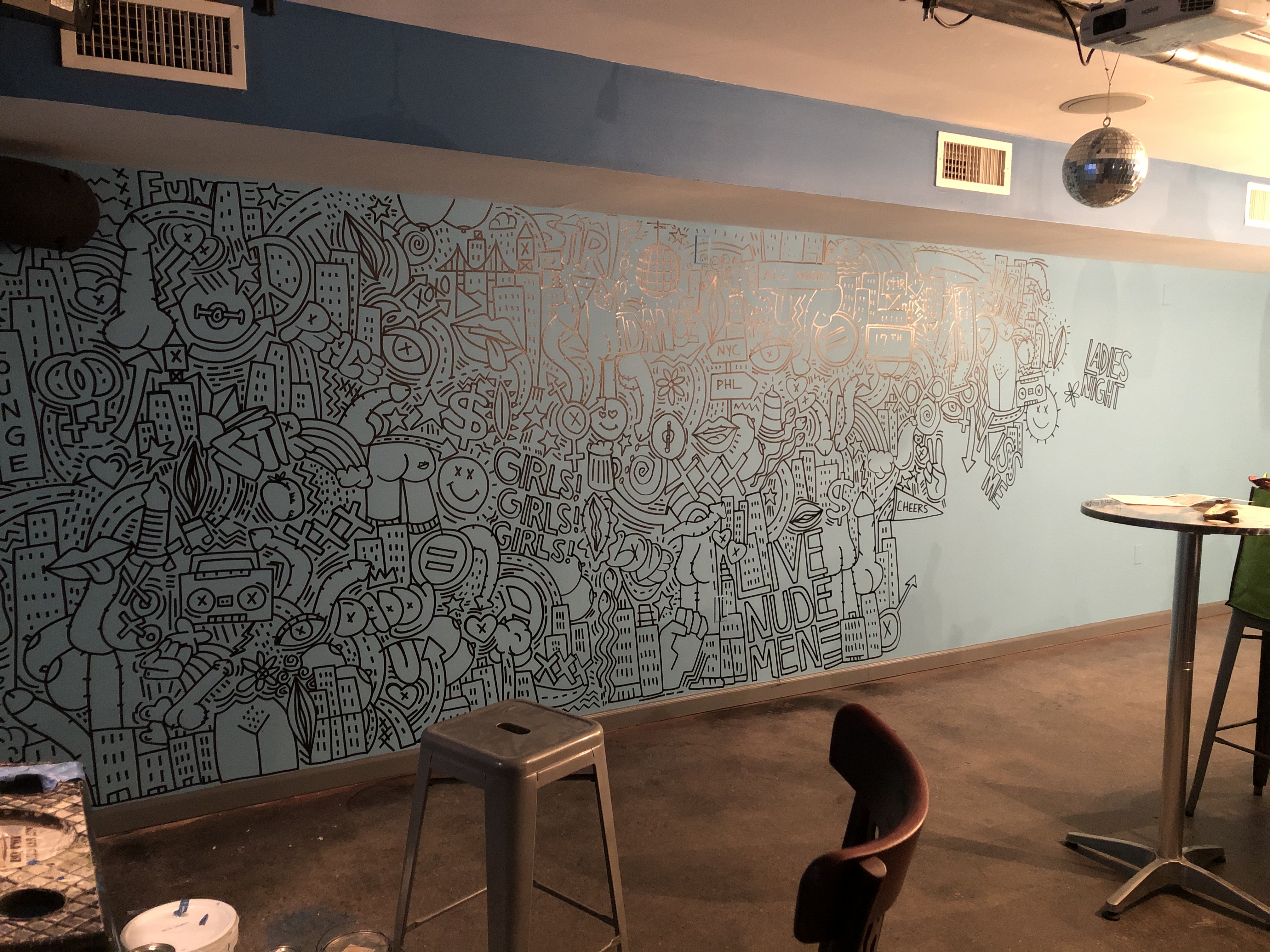 I was invited to create an erotic mural at Stir, a popular nightclub in Philly. The goal was to pay tribute to the venue’s historic roots as a gay men’s bar with a backroom. During its storied past, the bars walls were covered with homoerotic illustrations of nude men. As such, I ultimately wanted this new art piece to encompass everything kinky/sexy/erotic from the past but in a more whimsical design that would ultimately appeal to today’s diverse LGBT community.