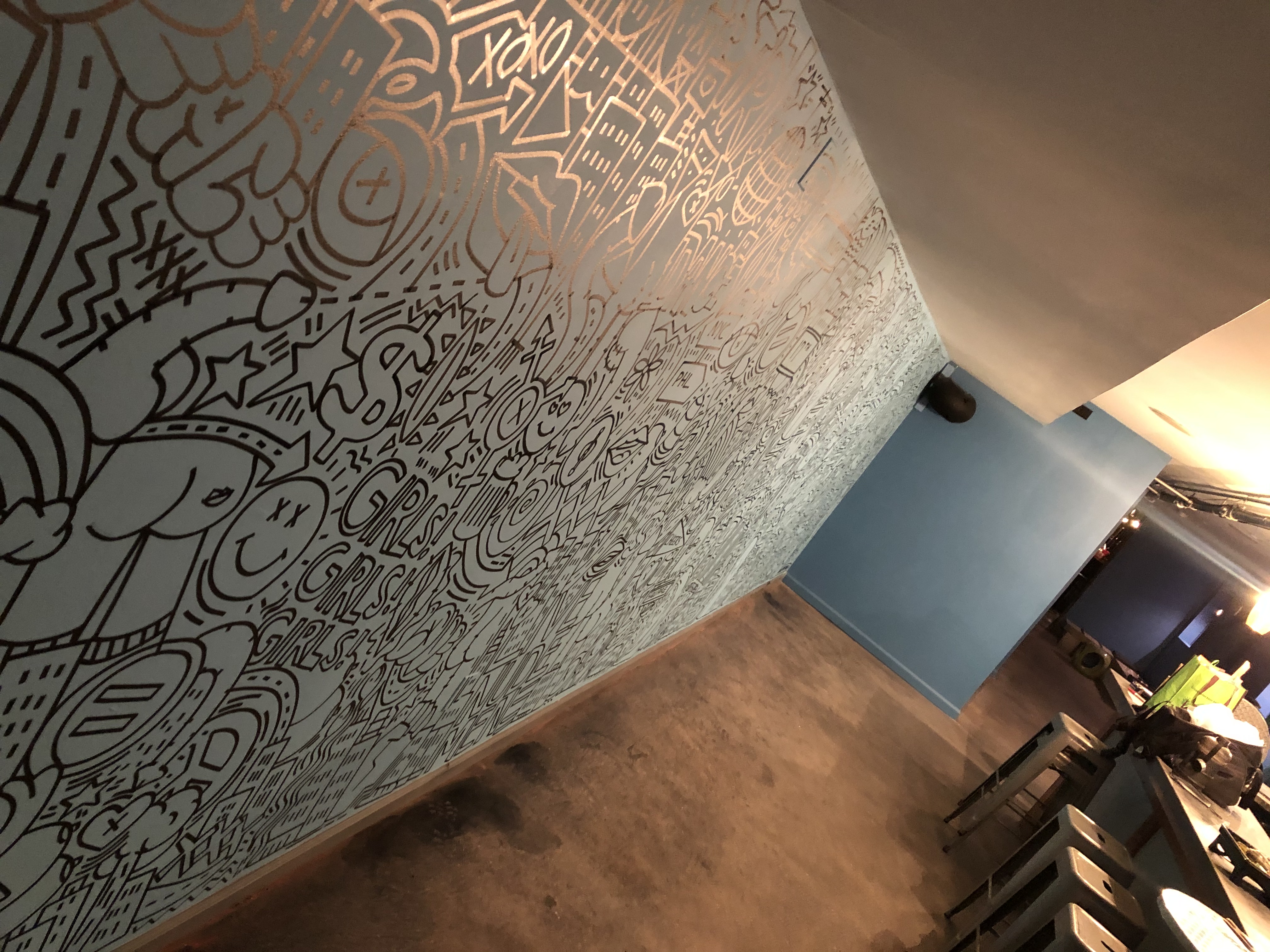 I painted this freehand in about six hours using words and images inspired by street art, sex and nightlife. Much of the subject matter, while adult, is combined with less serious iconography that’s deconstructed into simple lines and designs. I really wanted this new art piece to be a lighthearted/decorative backdrop to the experiences a queer community of people will be having when the space reopens again this year. It’s my first (and hopefully not last) mural erotica!