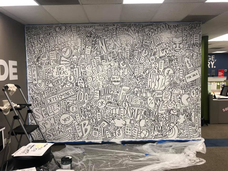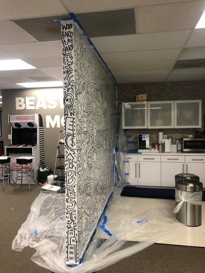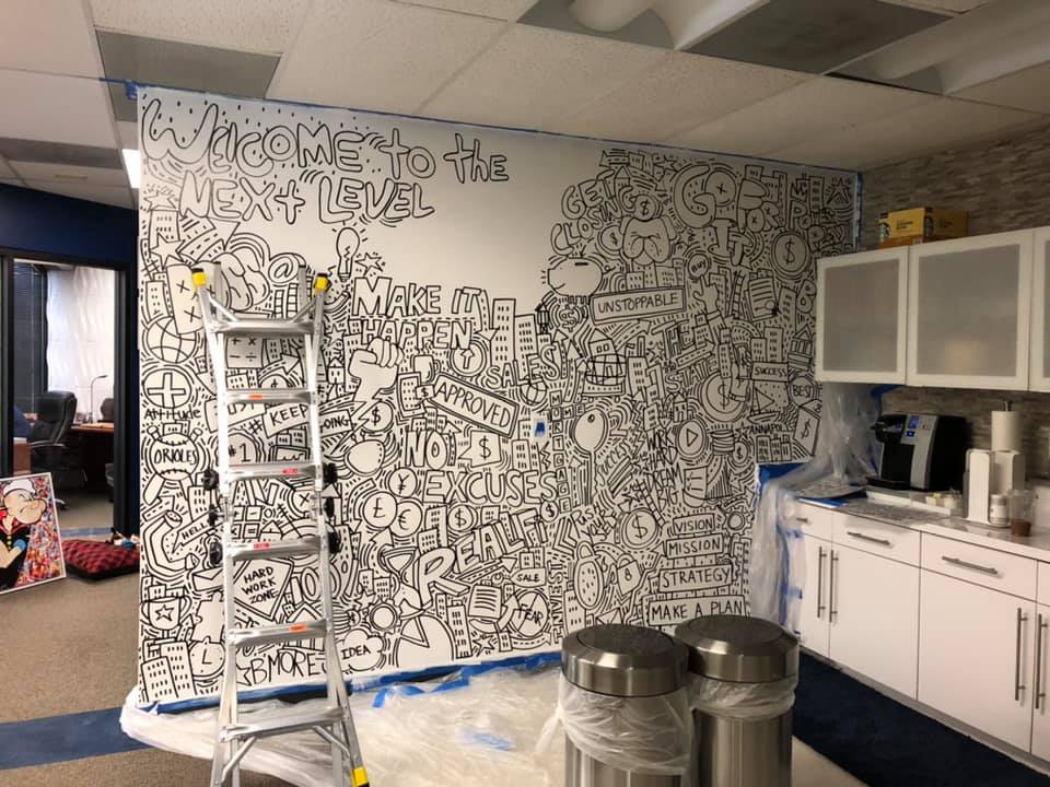 I recently spent the day near Baltimore painting a mural for a very progressive mortgage company. The owner wanted a graffiti/street art theme that would inspire the staff. So I painted by hand both sides of a 24-foot-long wall (about eight feet tall) in a little less than six hours. I used a combination of words and images that we discussed in advance, otherwise the composition was completely freeform. At one point the owner was throwing out some ideas that I was painting in real time. And while I didn’t get to play the Nintendo, it was a great place to work. I can see why this indie is on the short list of fast becoming one of the best workplaces in Baltimore.