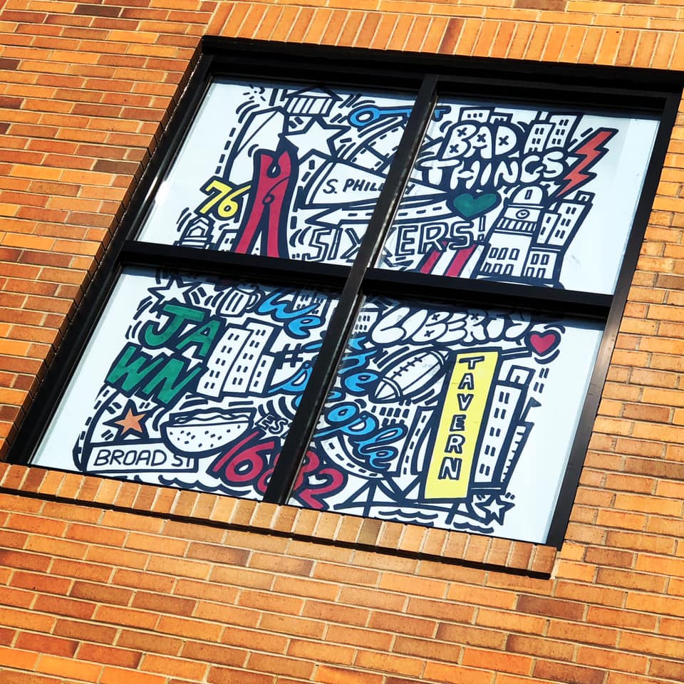 In addition to painting a mural at Wharton Flats, a new residential building in South Philadelphia, I also created window art. The client wanted a graffiti-stye design with touches of color to appeal to a younger demographic. We settled on famous words and images related to the neighborhood and city at large, using a whimsical design style and primary color palette. The design was printed on four extra-large window covers that can be seen from the outside but that still allow light into the stairwell.