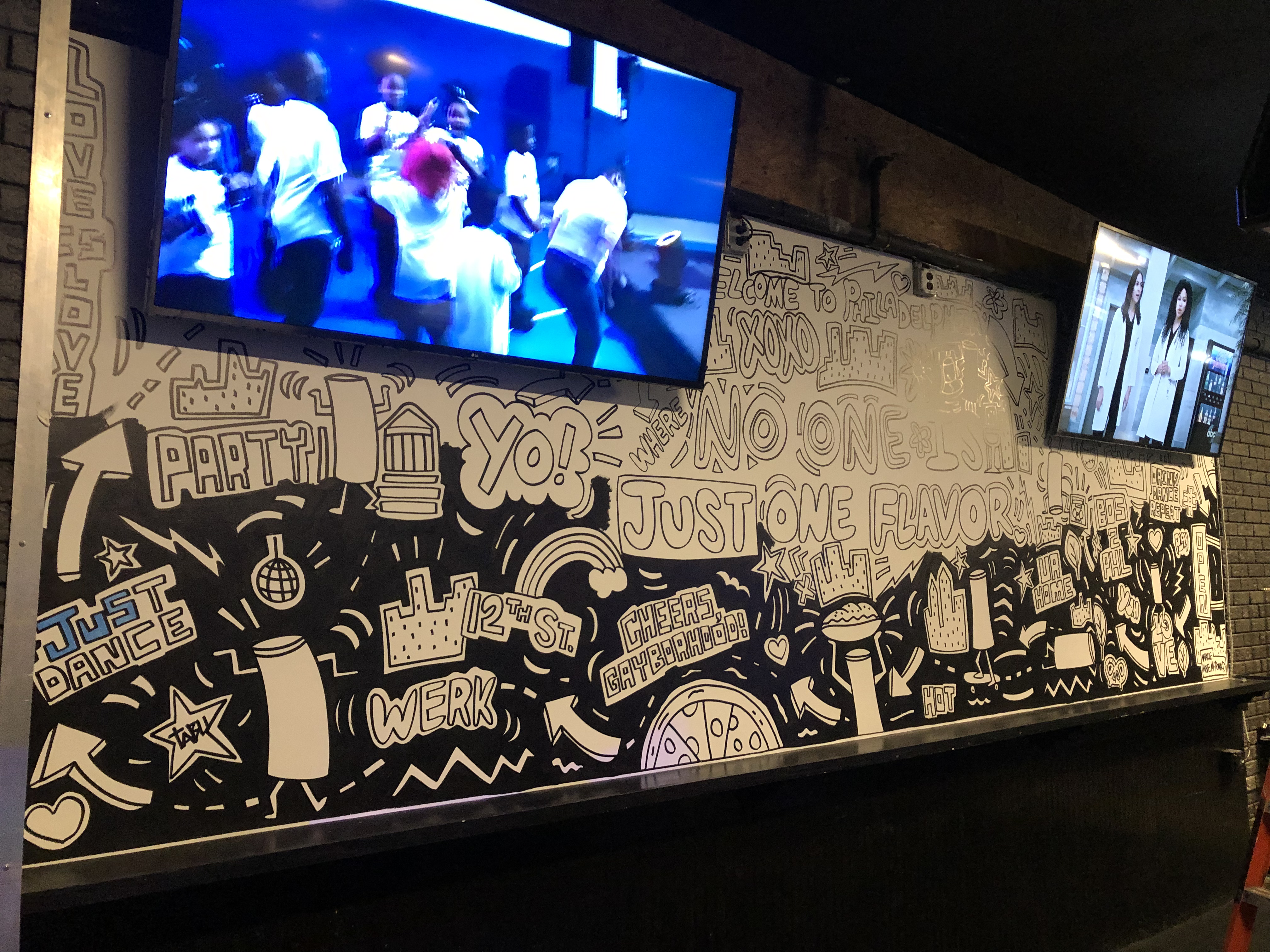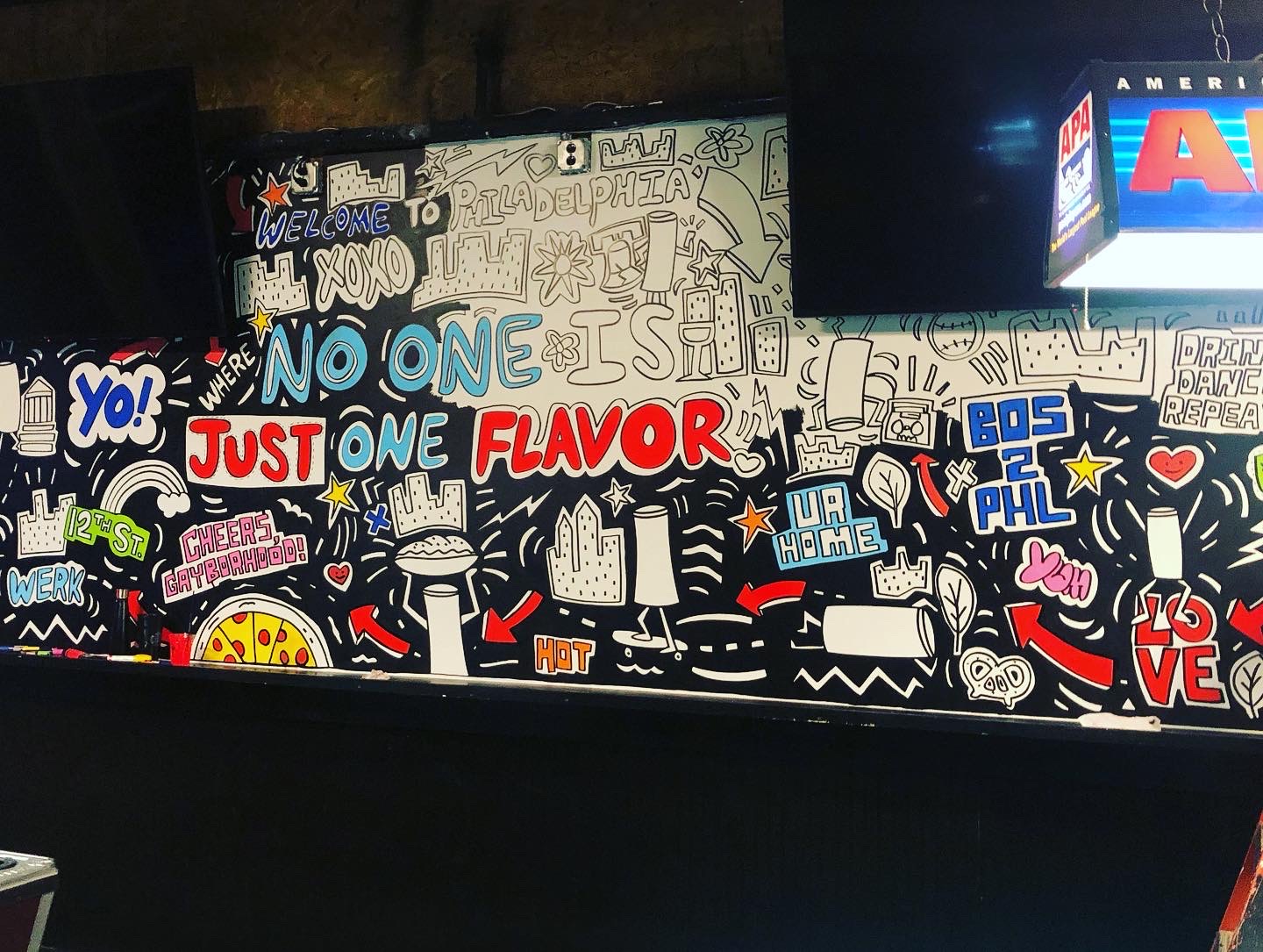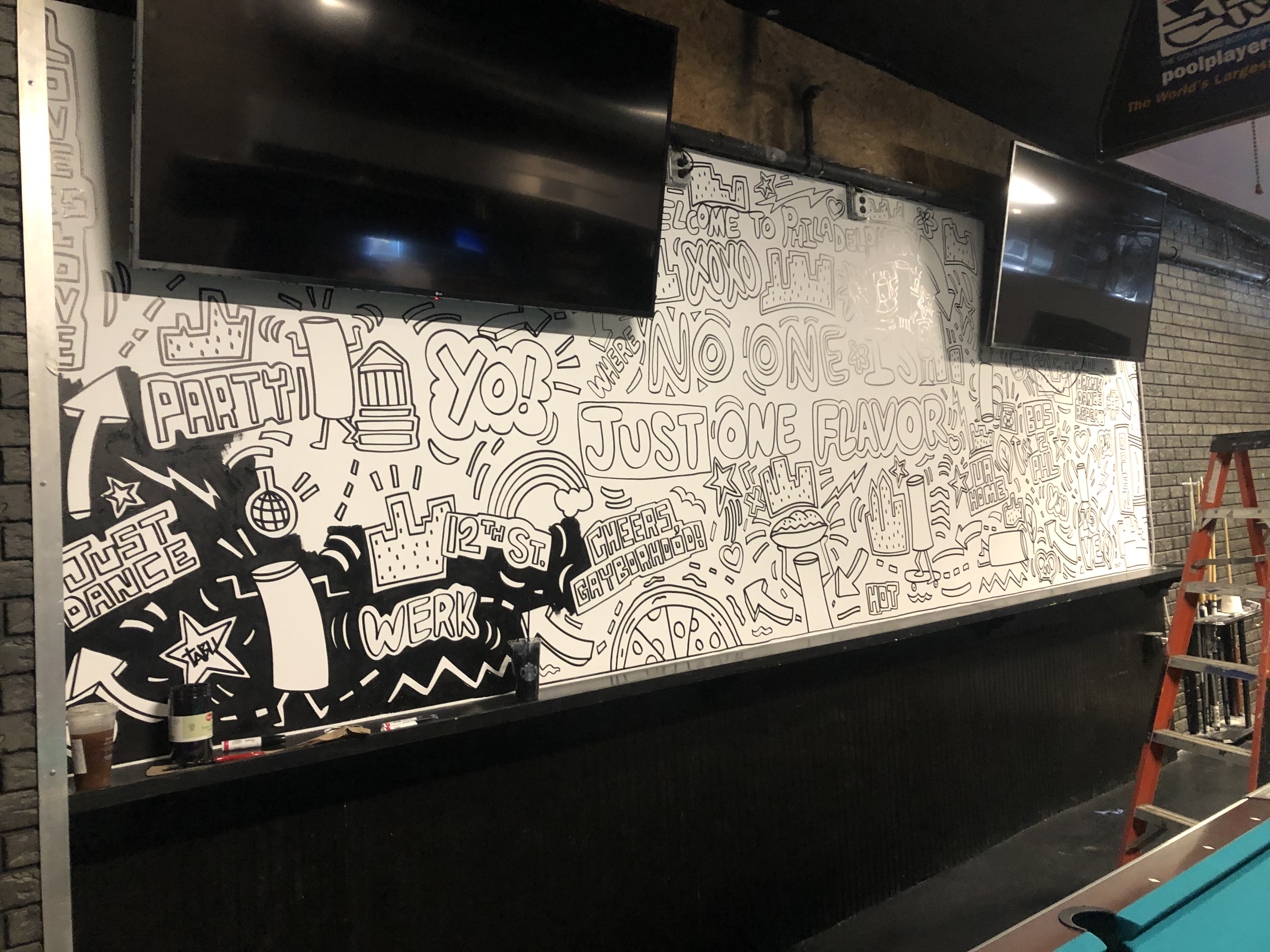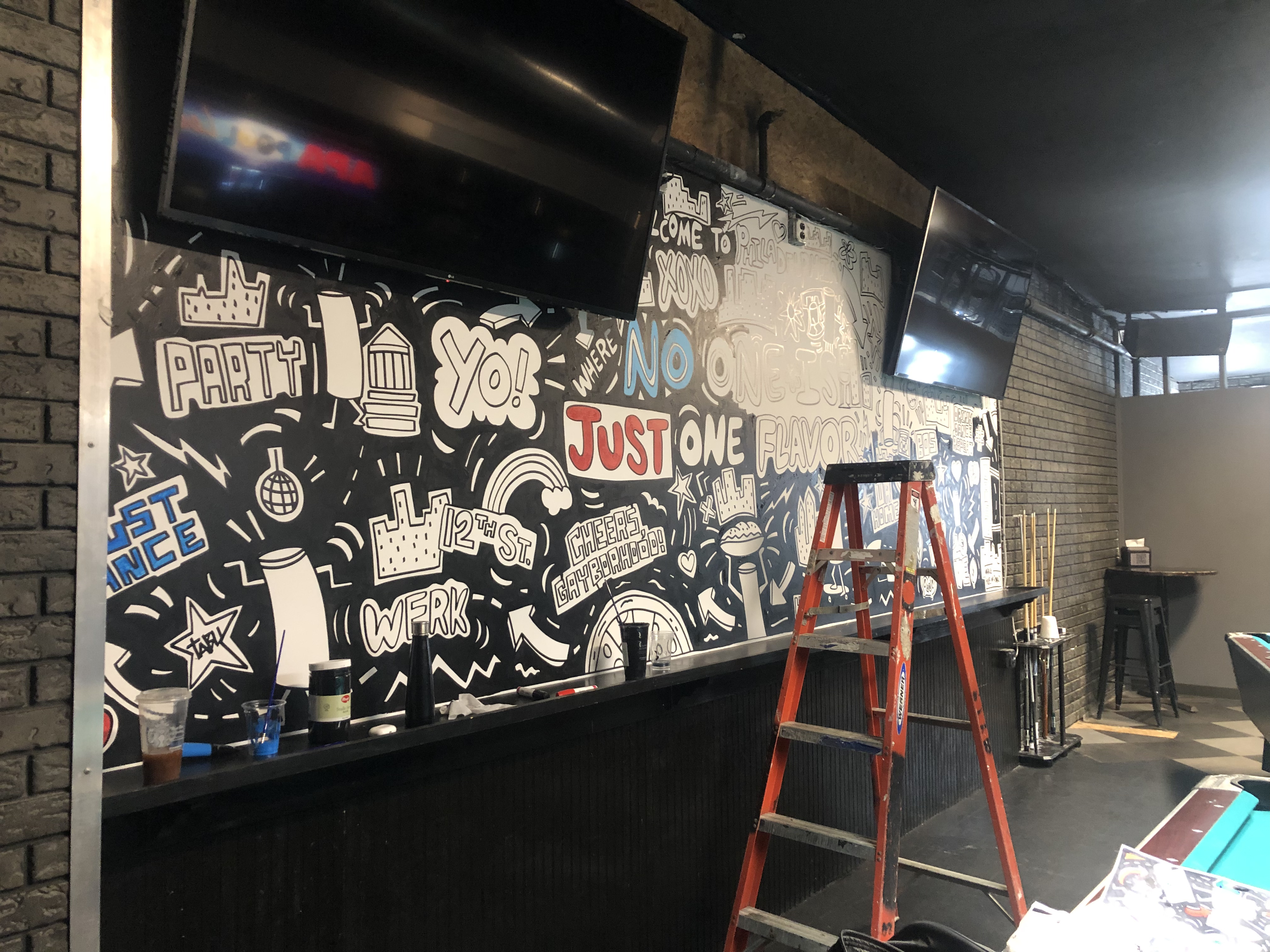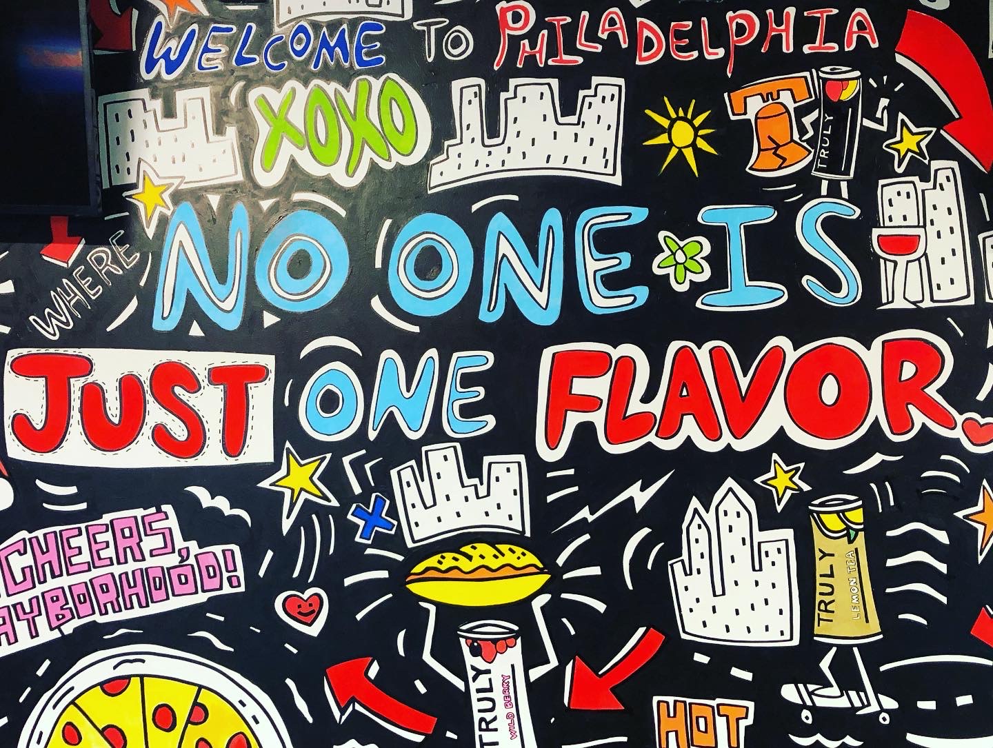 I had the chance to create a full color mural at Tabu, a multi-story nightclub in Philly. The goal was to create something fun in the gaming space where there’s a smaller bar, pool tables and other games, that celebrates Truly, a hard seltzer from Boston Beer Company.