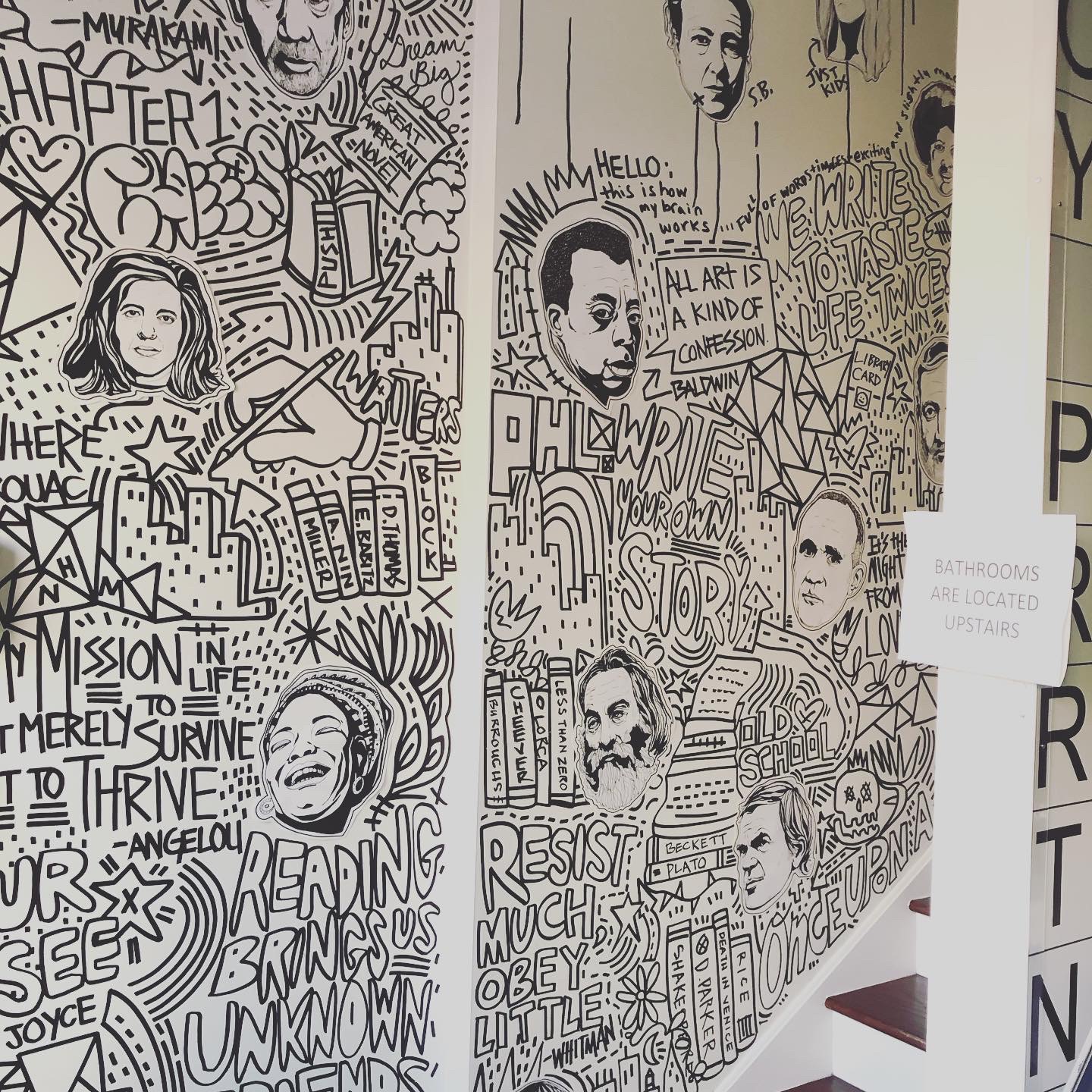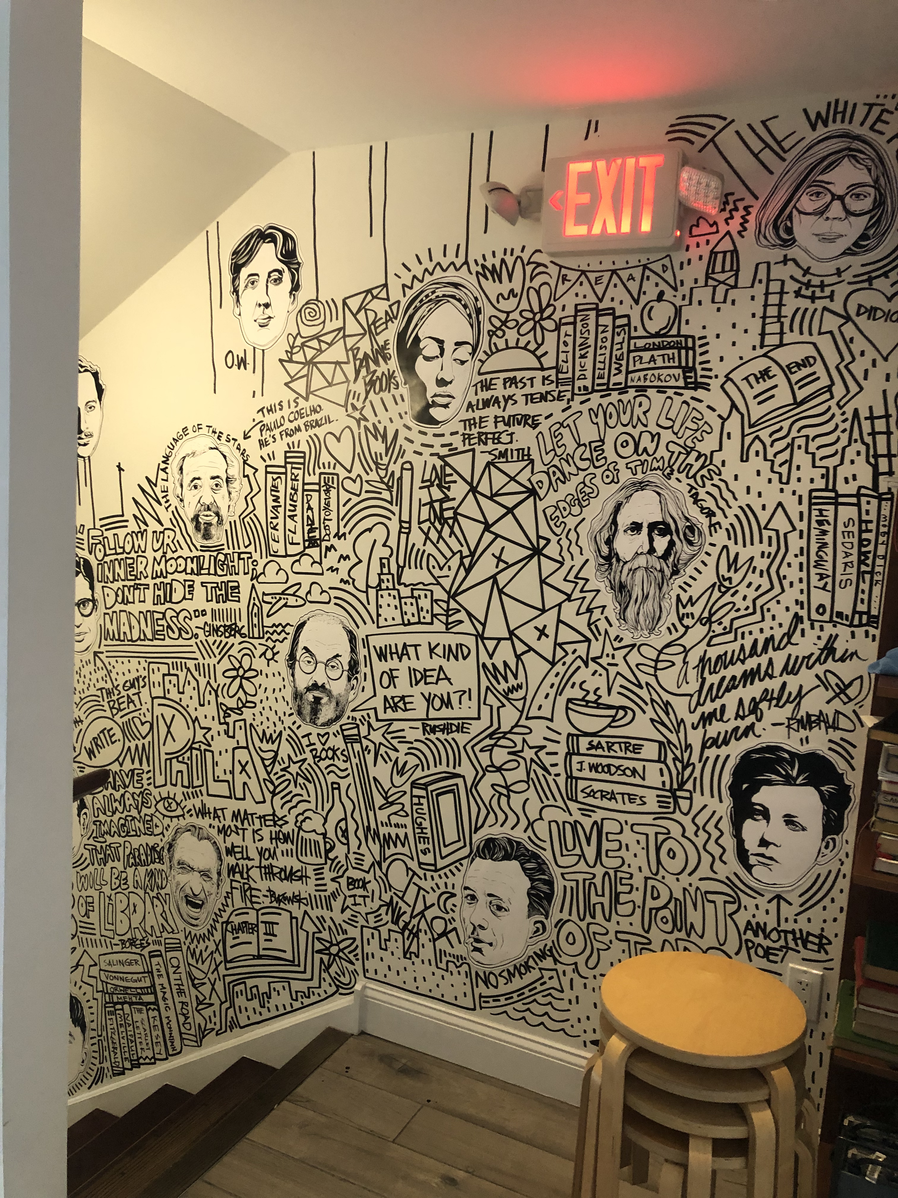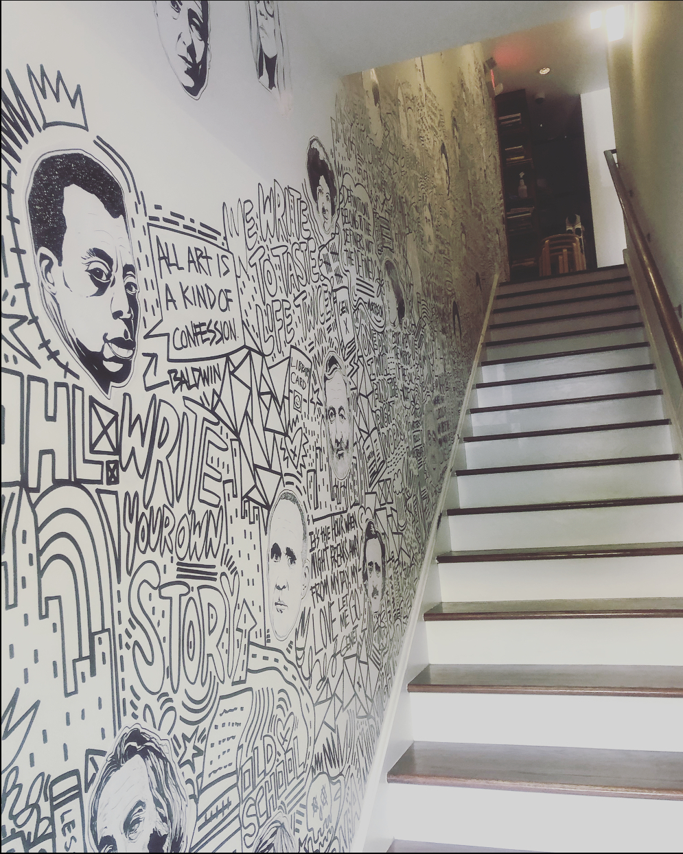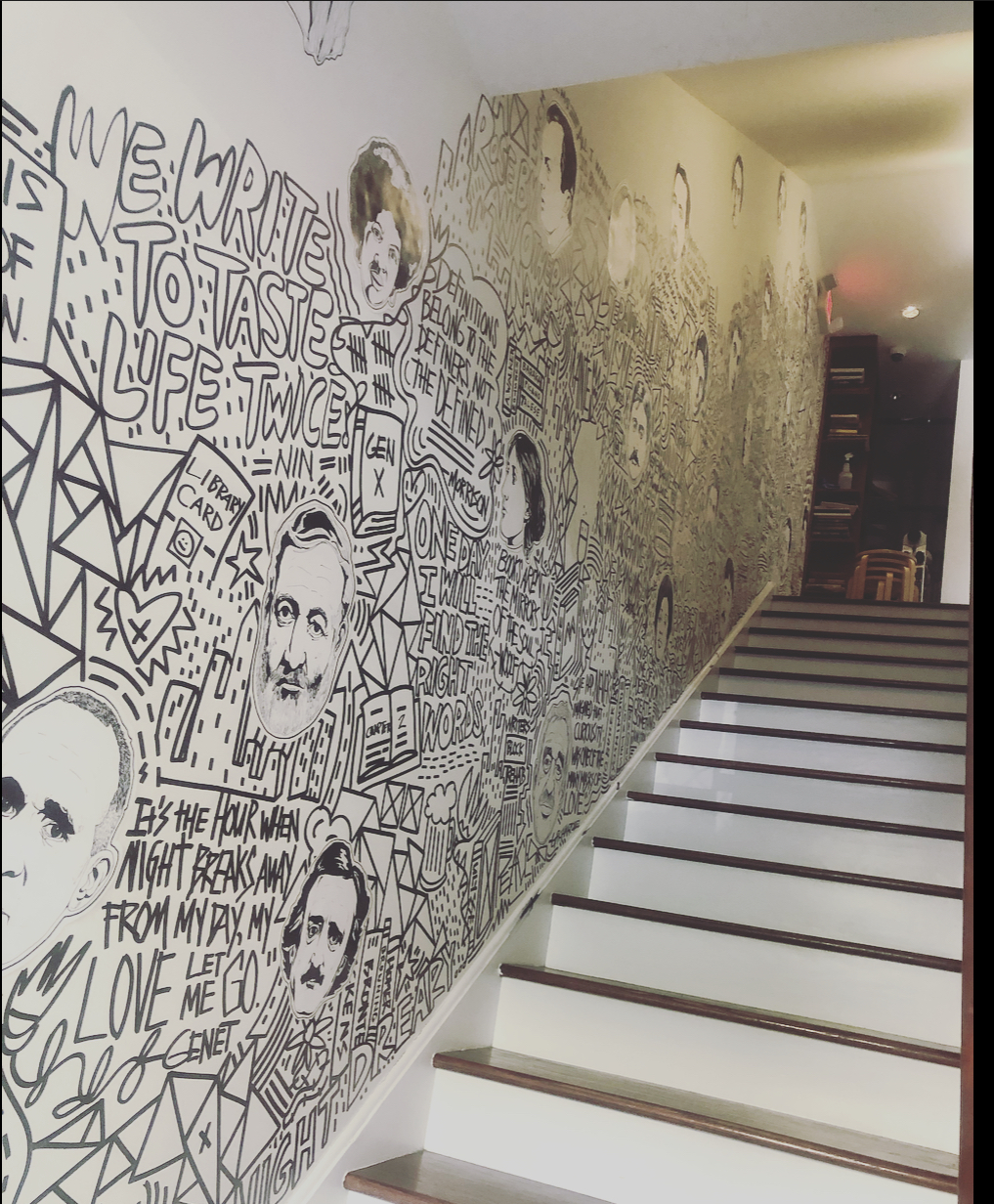 I had the opportunity to create an original mural at Writer’s Block Rehab. The goal was to celebrate authors, first by drawing unique portraits of about 40 different writers that are woven within a pastiche of graffiti-inspired words and images that were painted directly onto the walls. The mural starts at the entrance and meanders up the stairs to the second floor.