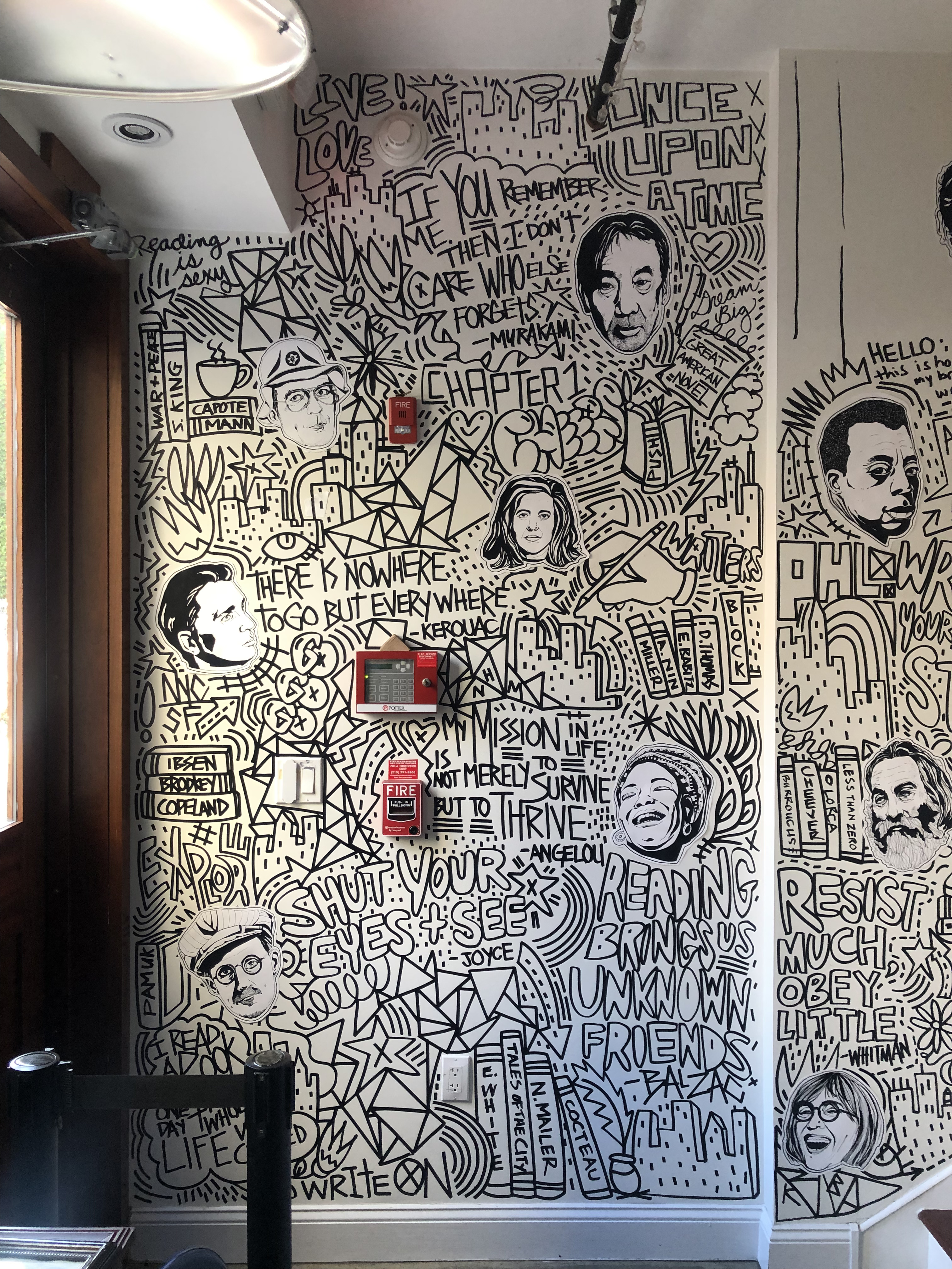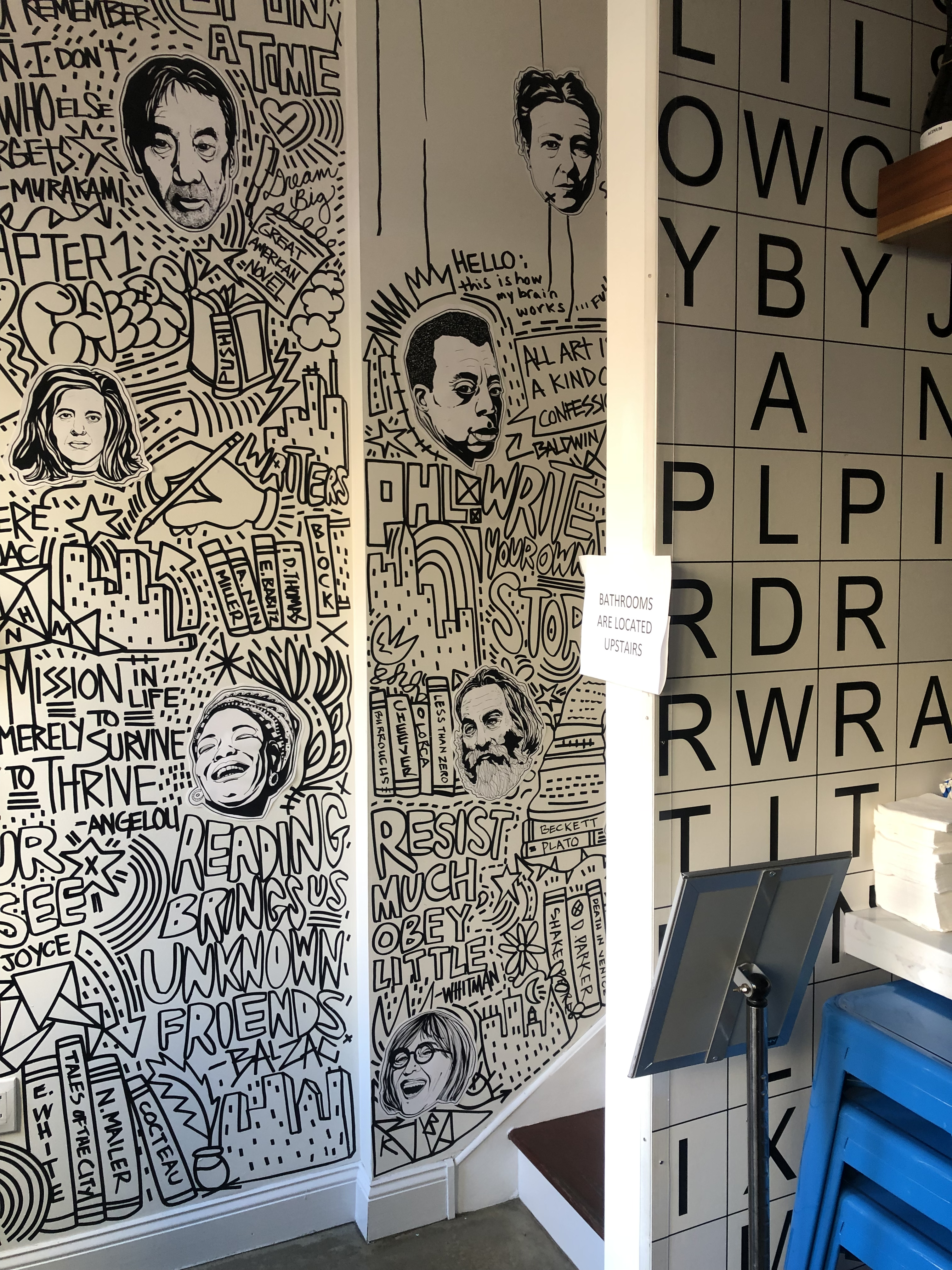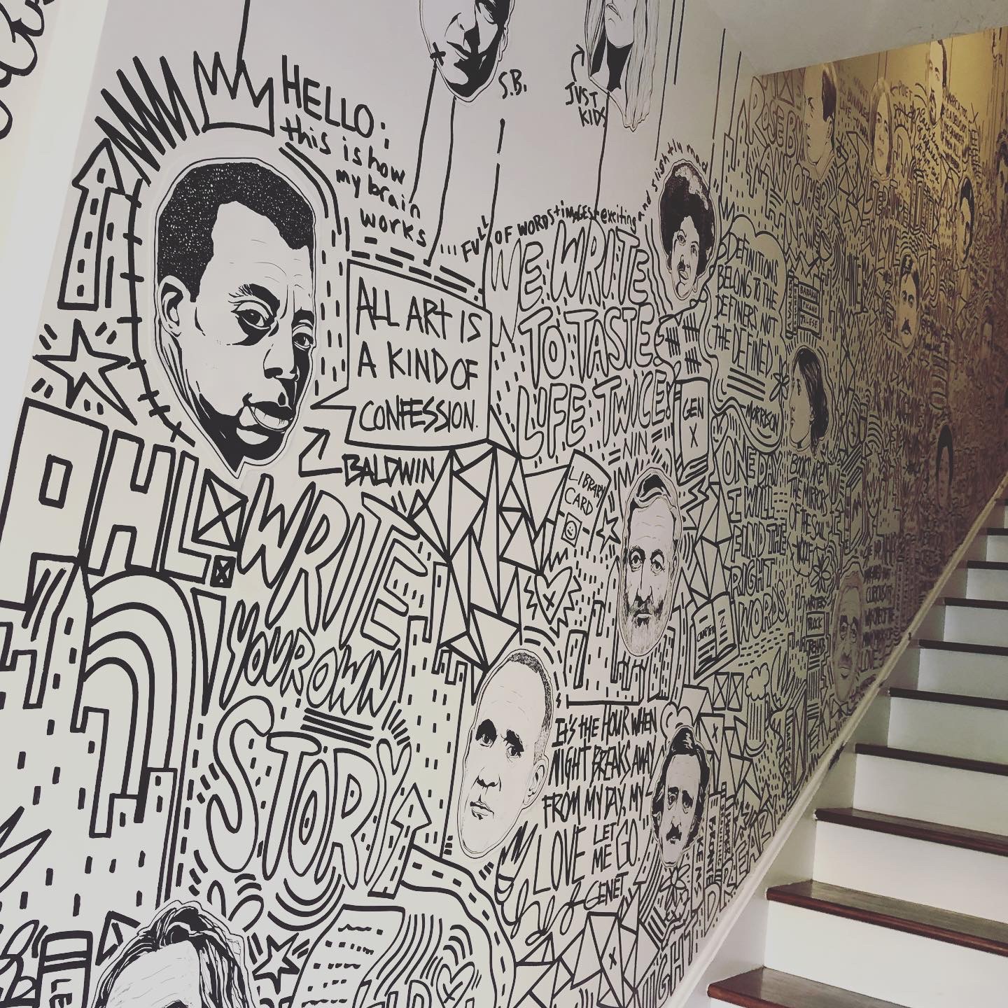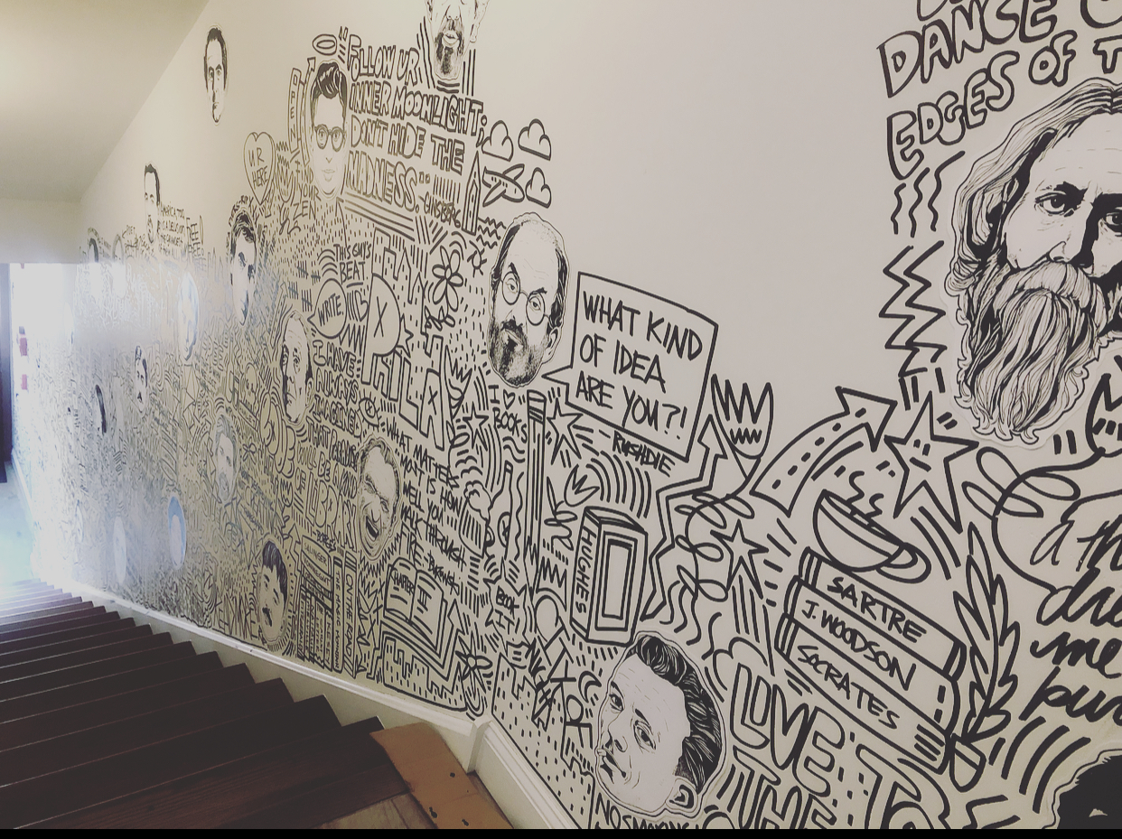 I had the opportunity to create an original mural at Writer’s Block Rehab. The goal was to celebrate authors, first by drawing unique portraits of about 40 different writers that are woven within a pastiche of graffiti-inspired words and images that were painted directly onto the walls. The mural starts at the entrance and meanders up the stairs to the second floor.