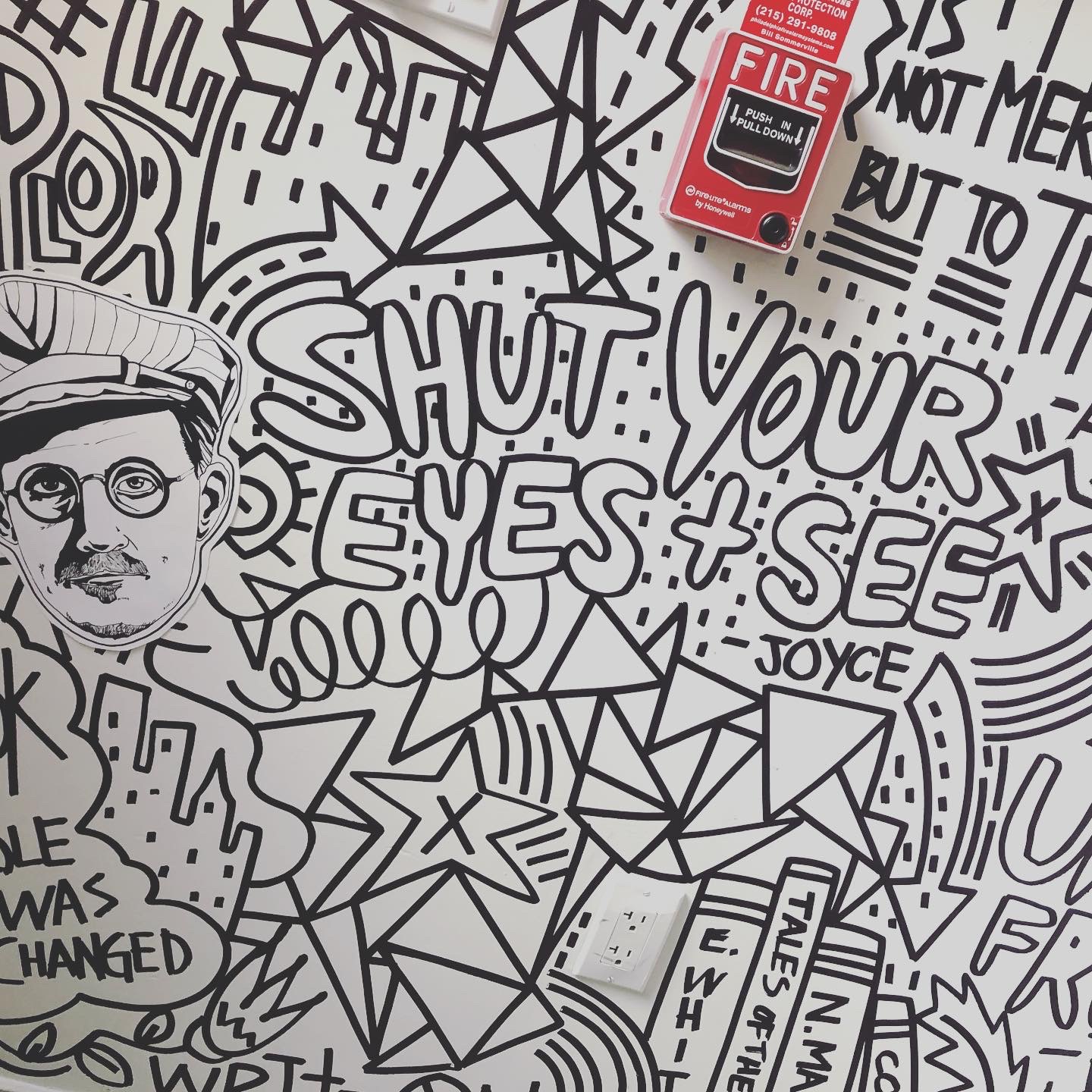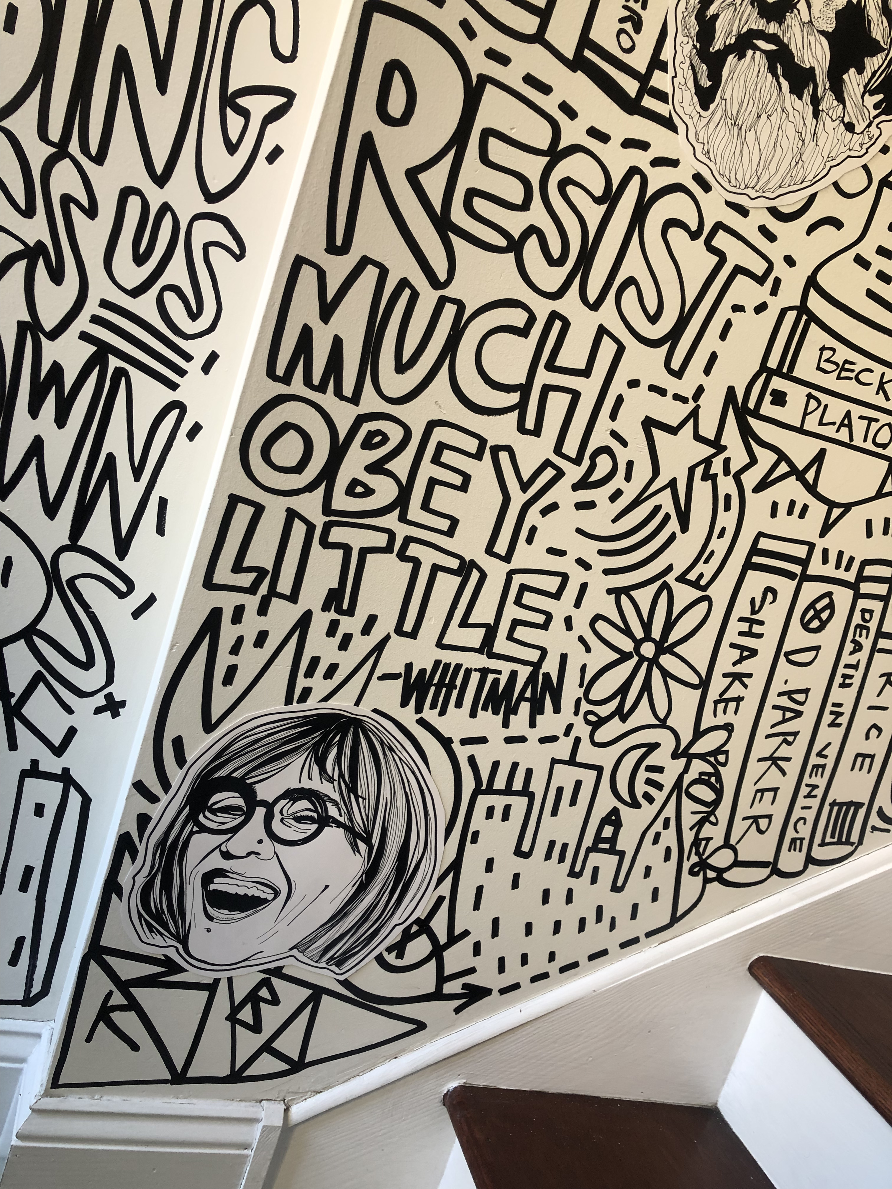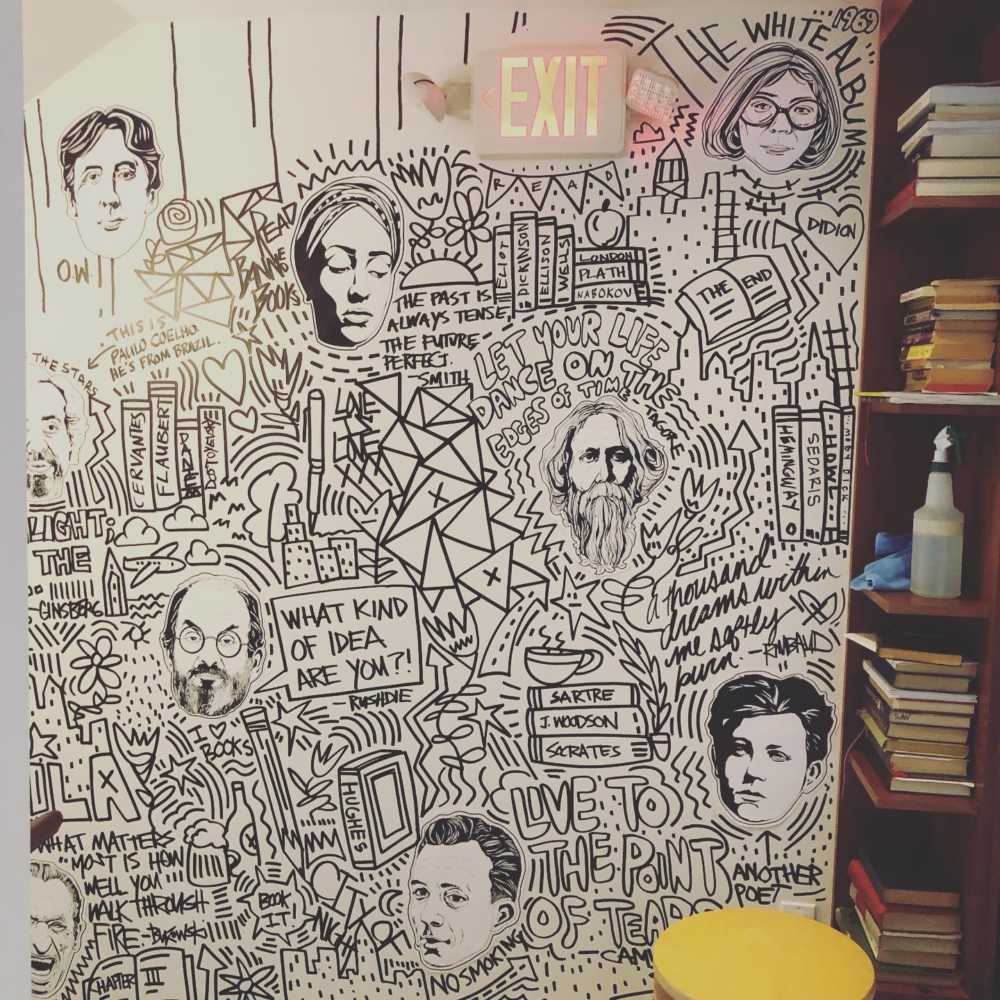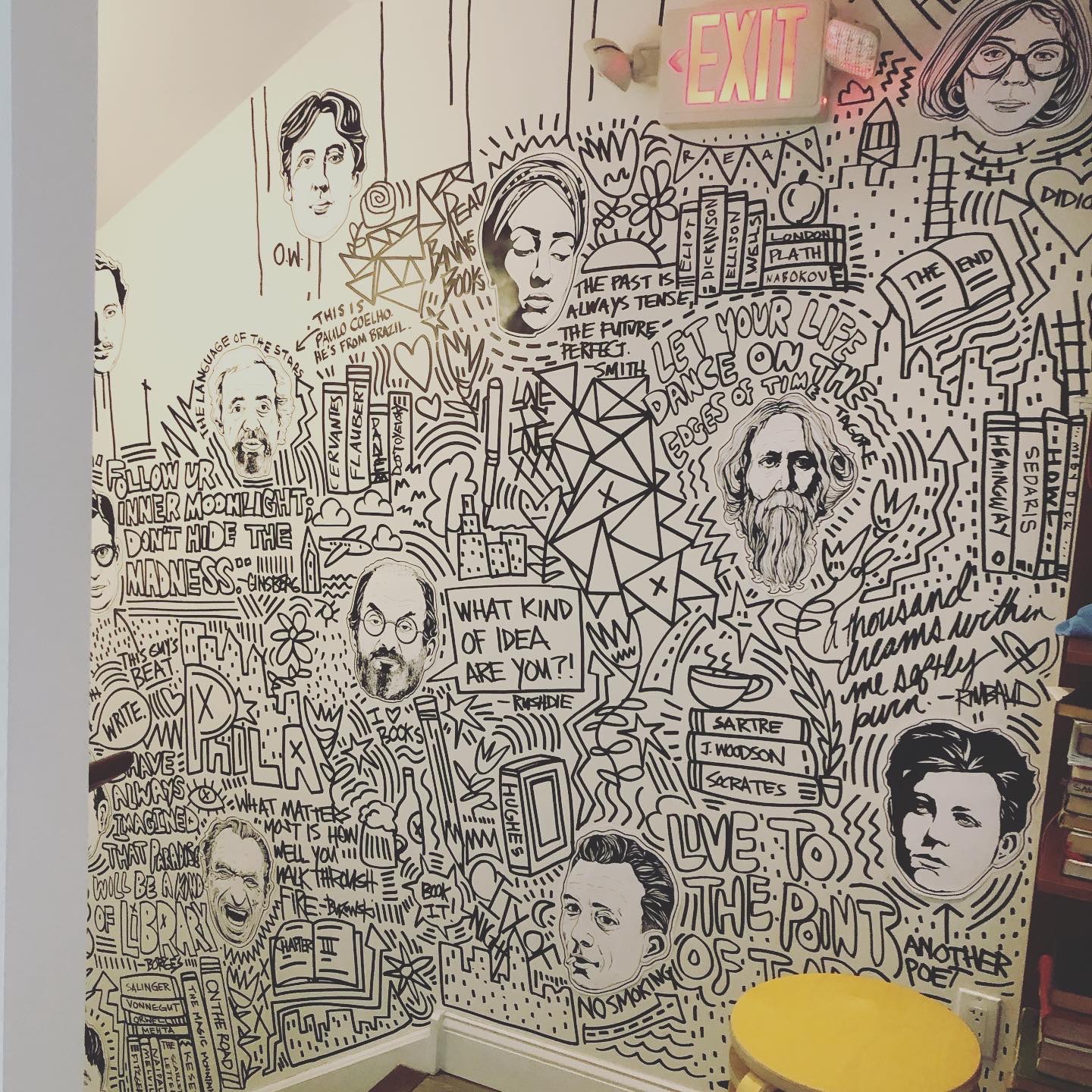 I had the opportunity to create an original mural at Writer’s Block Rehab. The goal was to celebrate authors, first by drawing unique portraits of about 40 different writers that are woven within a pastiche of graffiti-inspired words and images that were painted directly onto the walls. The mural starts at the entrance and meanders up the stairs to the second floor.
