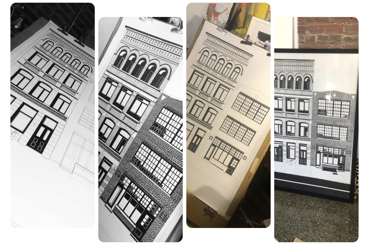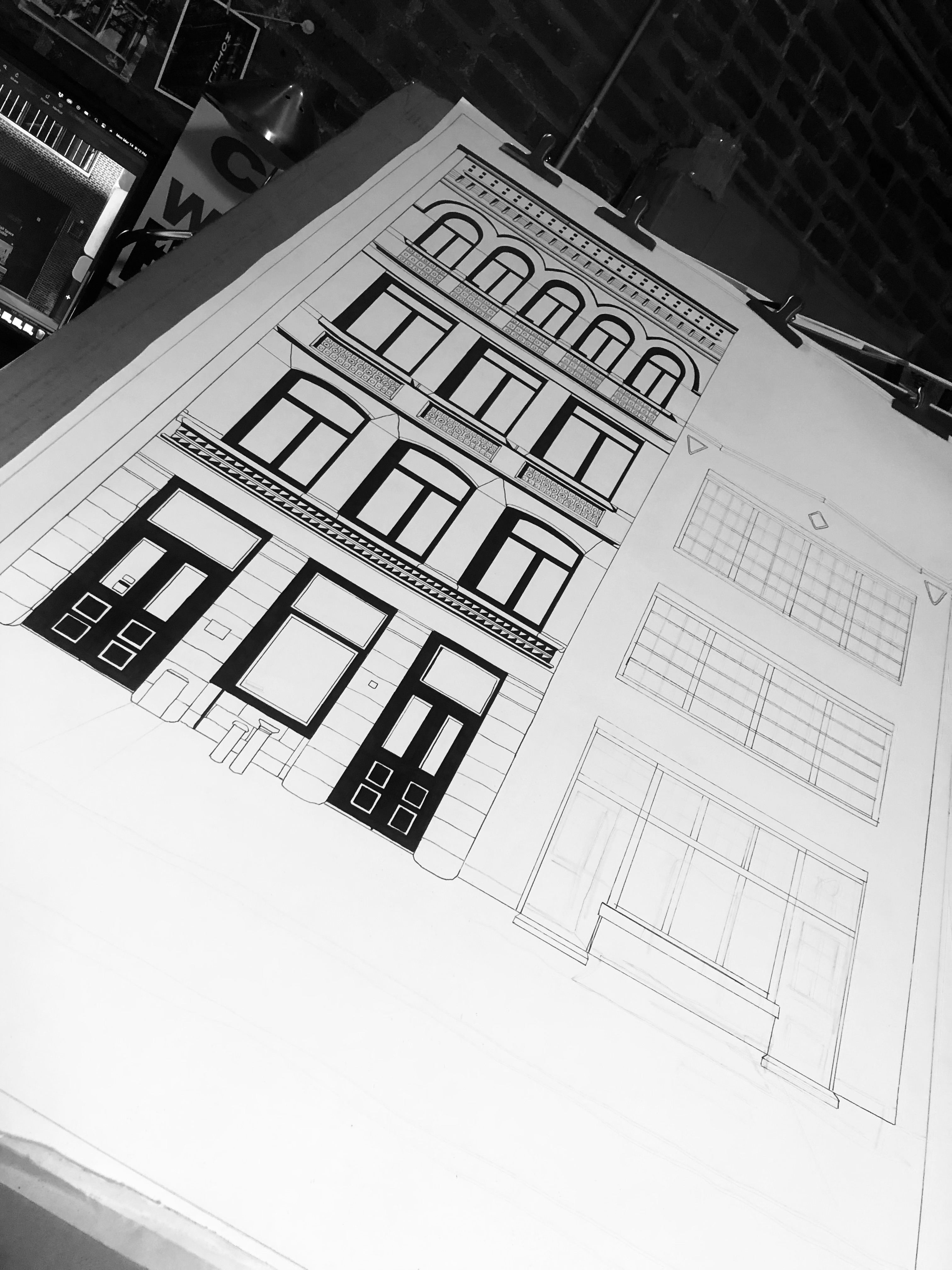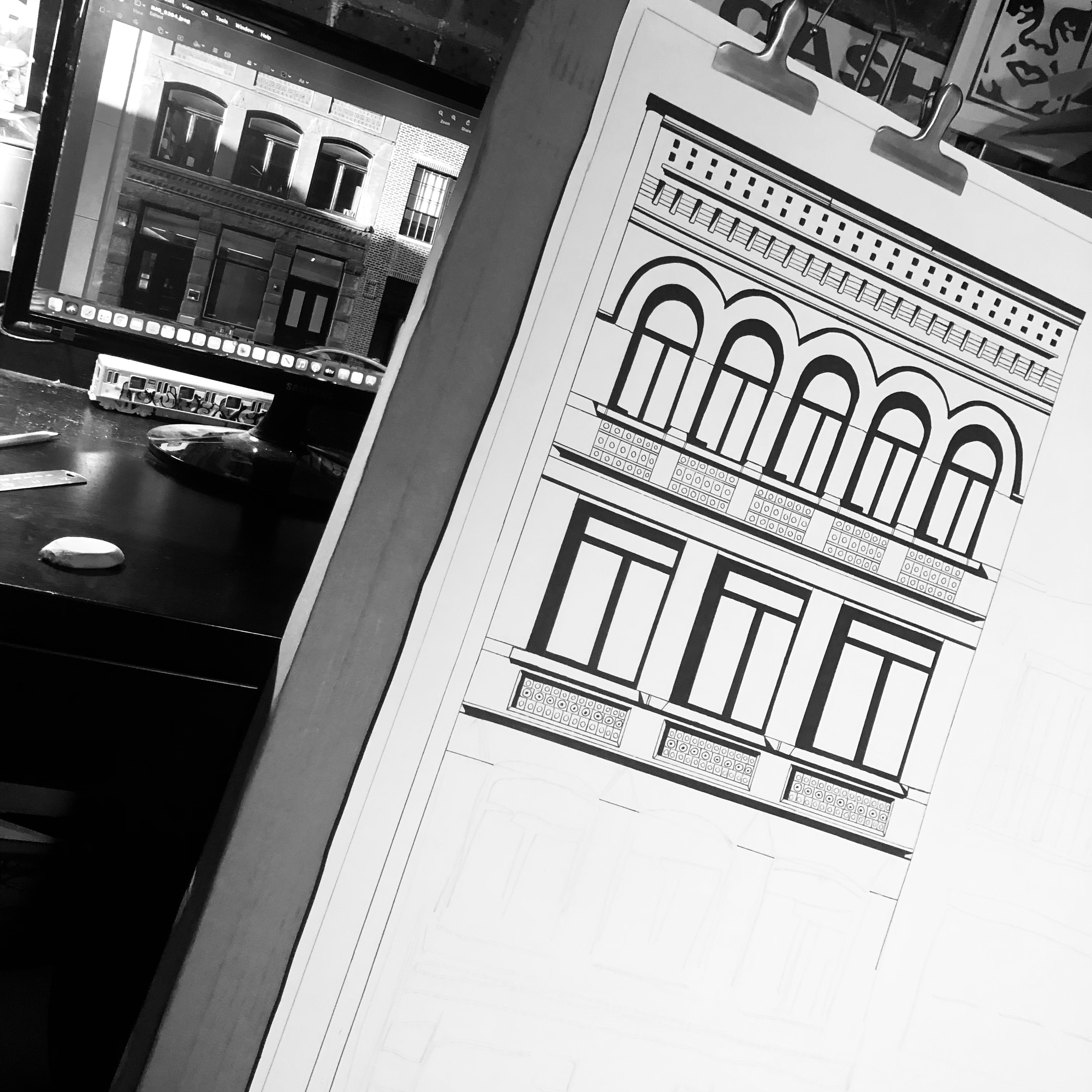 I was commissioned to create a 27×40-inch illustration on paper. The subject is a beautiful building in the Old City neighborhood of Philadelphia. The question I’m always asked if if I enjoy drawing the bricks. The answer is YES! The bricks are the best part.