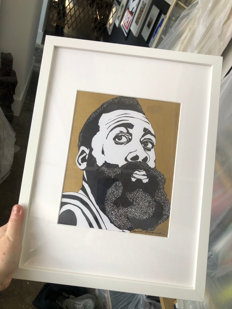 Created an original portrait of James Harden (a.k.a. The Beard), the newest member of the Philadelphia 76ers. These originals are each drawn by hand, painted with gold oil paint, matted, signed and framed. Different sizes available (pictured: 12×16 inches). Order now.