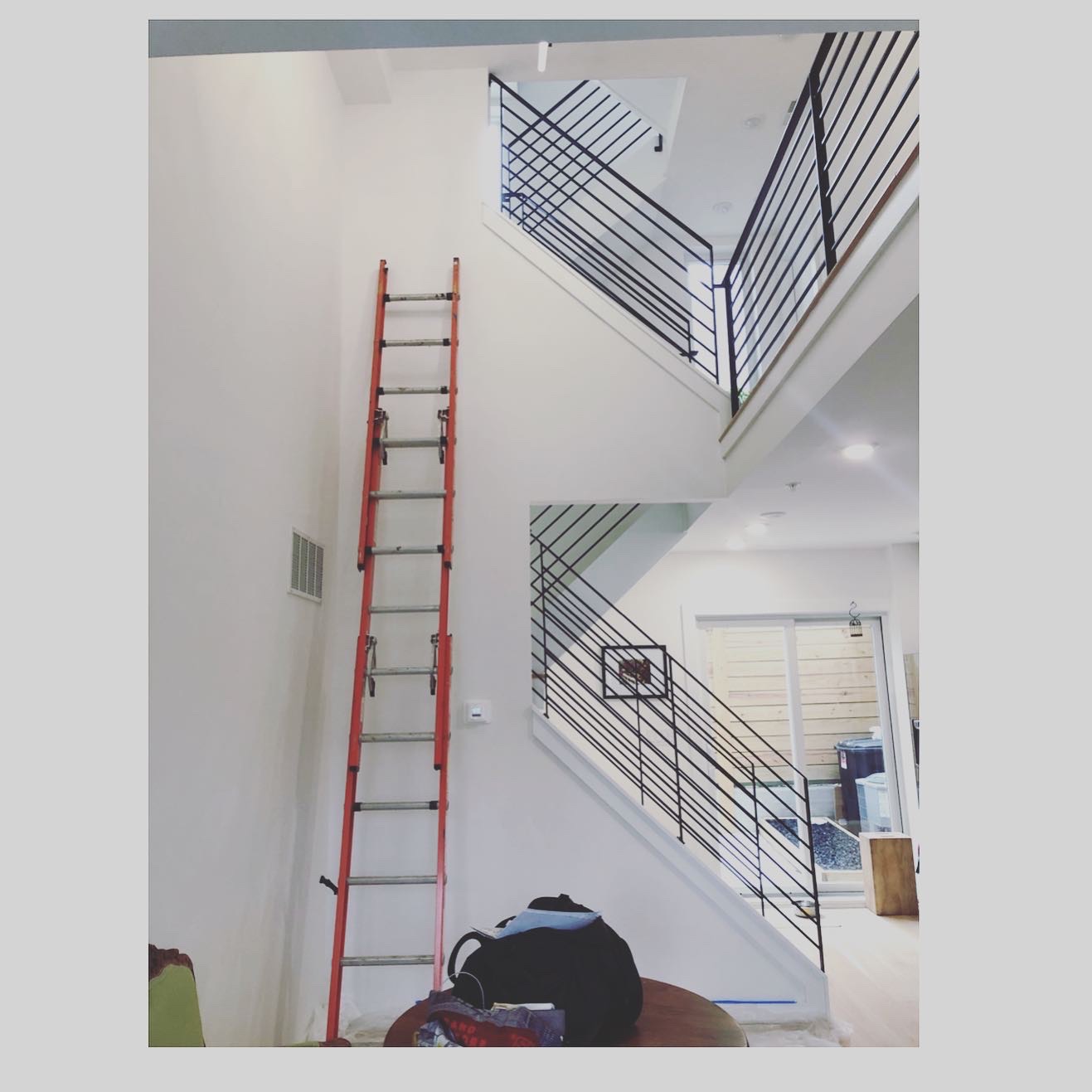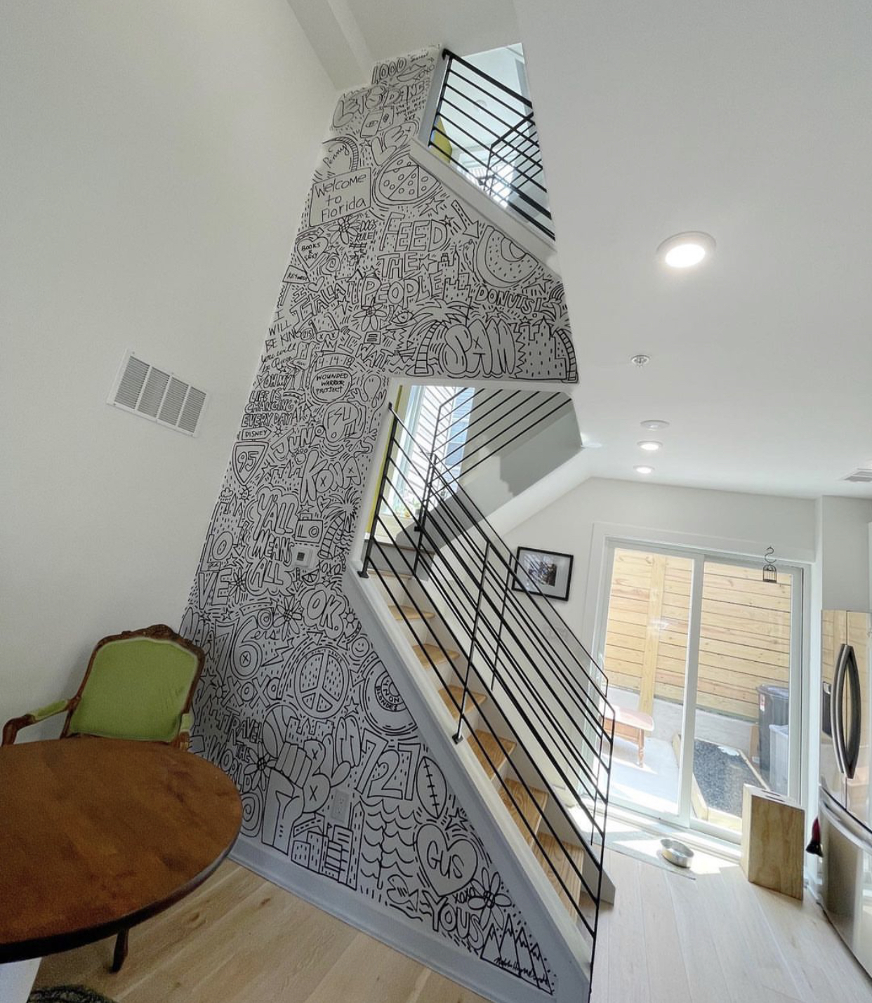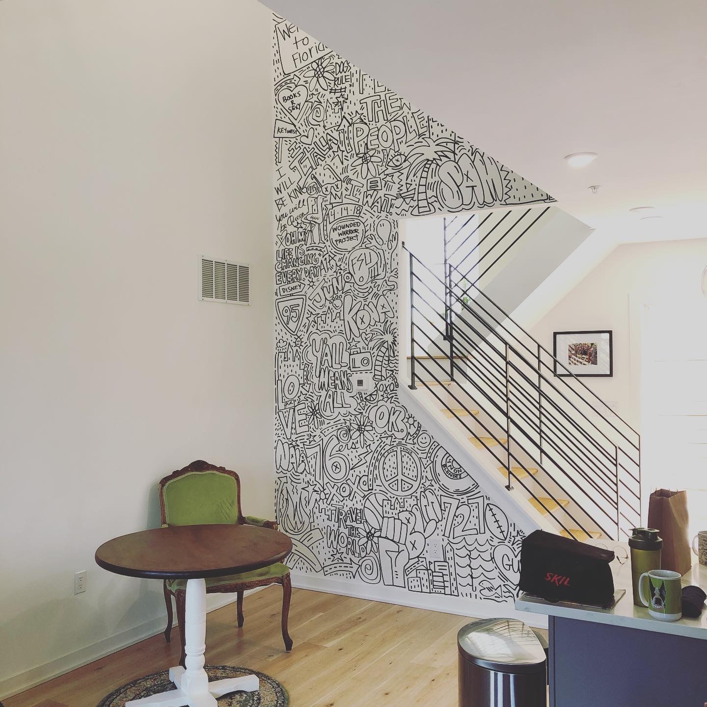 I had the pleasure to work with clients on a mural for their beautiful home. The mural itself extended upwards to three stories inside the living room, which has well over 20-foot ceilings. I painted this freehand.