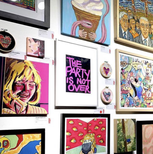 The exhibition at Dirty Frank’s Off the Wall Gallery – REEMERGE – has been a success. I sold the first in a series of word art pieces that I’m painting with fluorescent pink on silver mylar, THE PARTY IS NOT OVER.