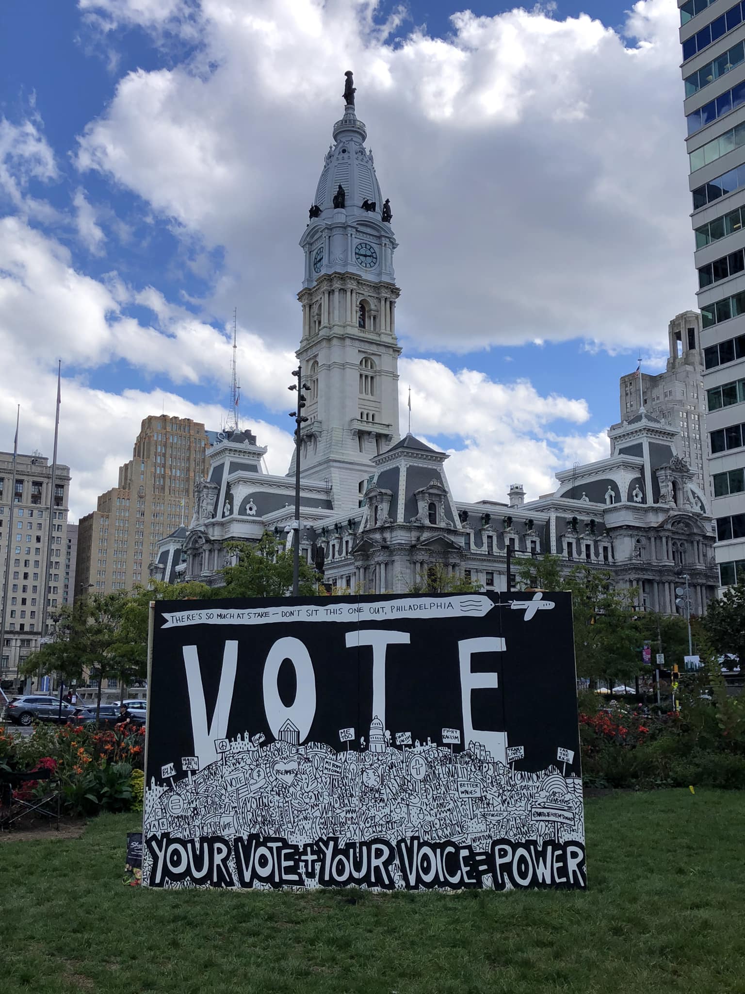 I spent a beautiful afternoon painting a new mural in Love Park as part of a public art project to encourage people to get out the vote this November. I worked with Mural Arts and Streets Department to create a black-and-white piece called YOUR VOTE EQUALS POWER.