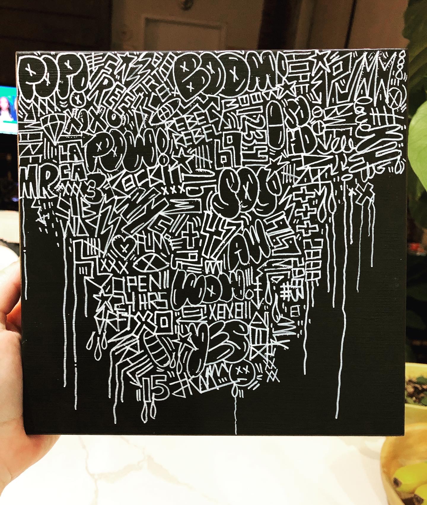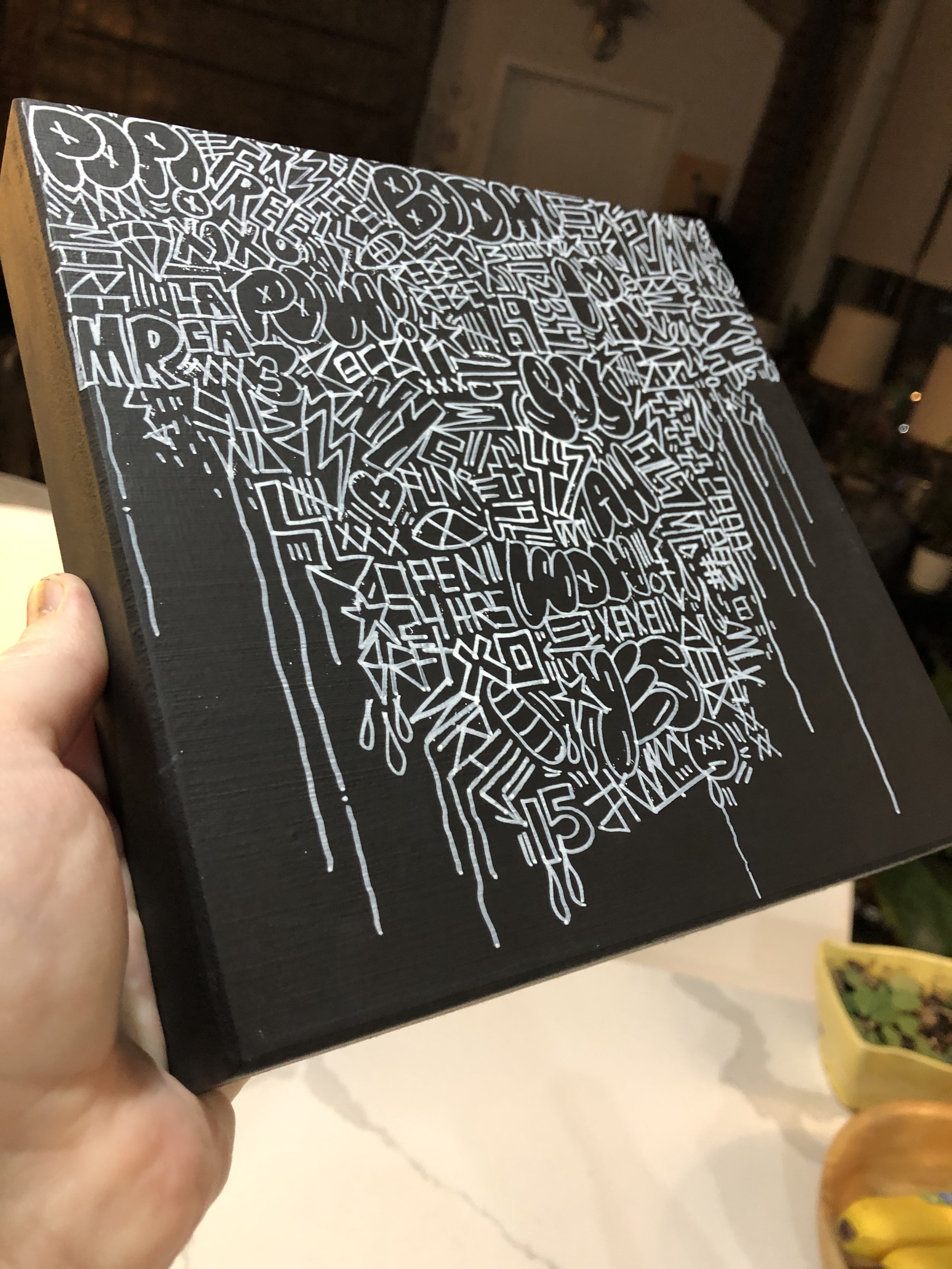 One series is a riff on DaVinci’s famous The Last Supper. I’ve been searching thrift stores for any interpretation of the painting (there are many!) and then apply my own graffiti-inspired designs. These are highly satirical. The first one I painted is called “Eat Me” and is created atop a lacquered print that was originally carved from a tree trunk.