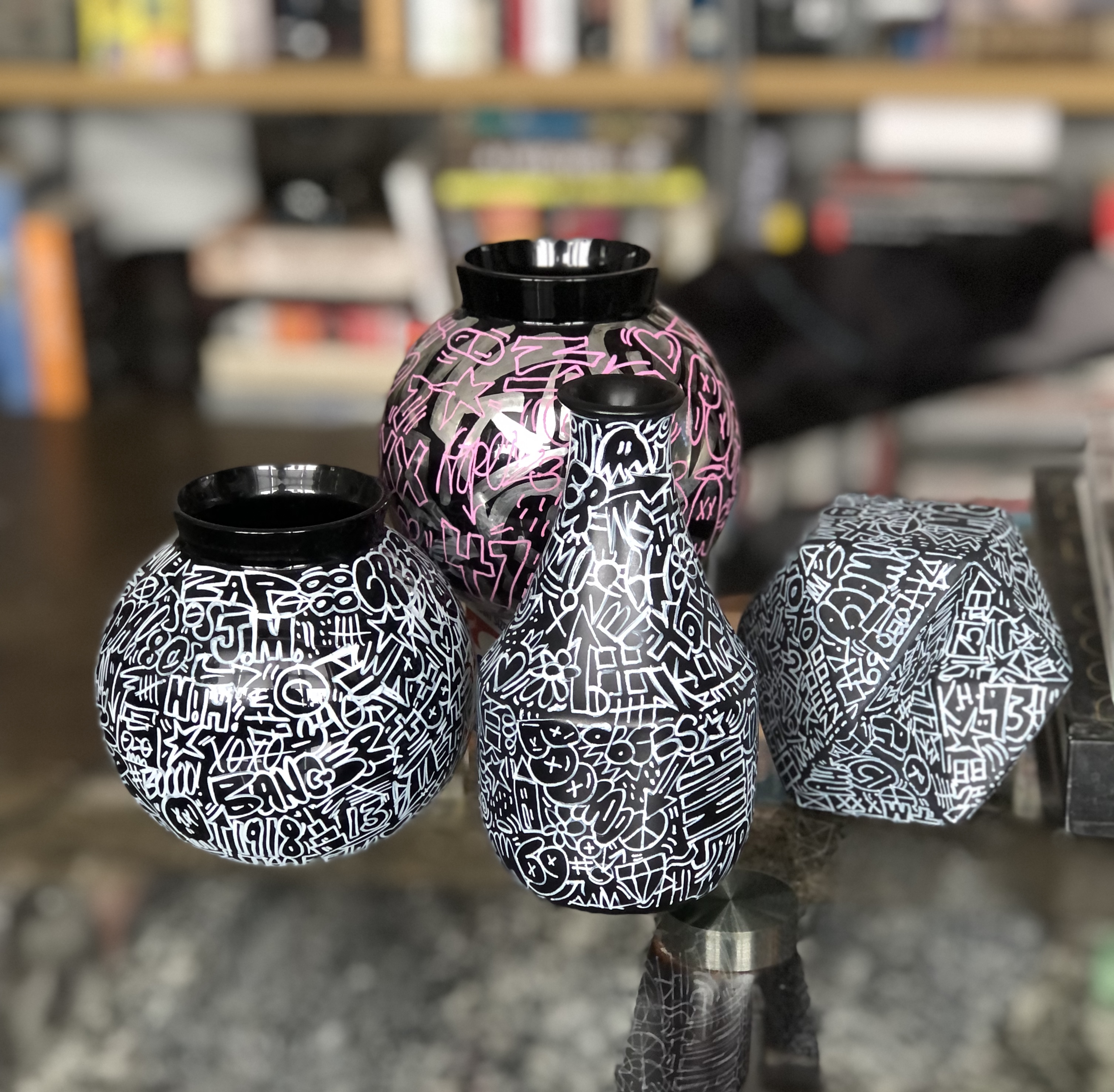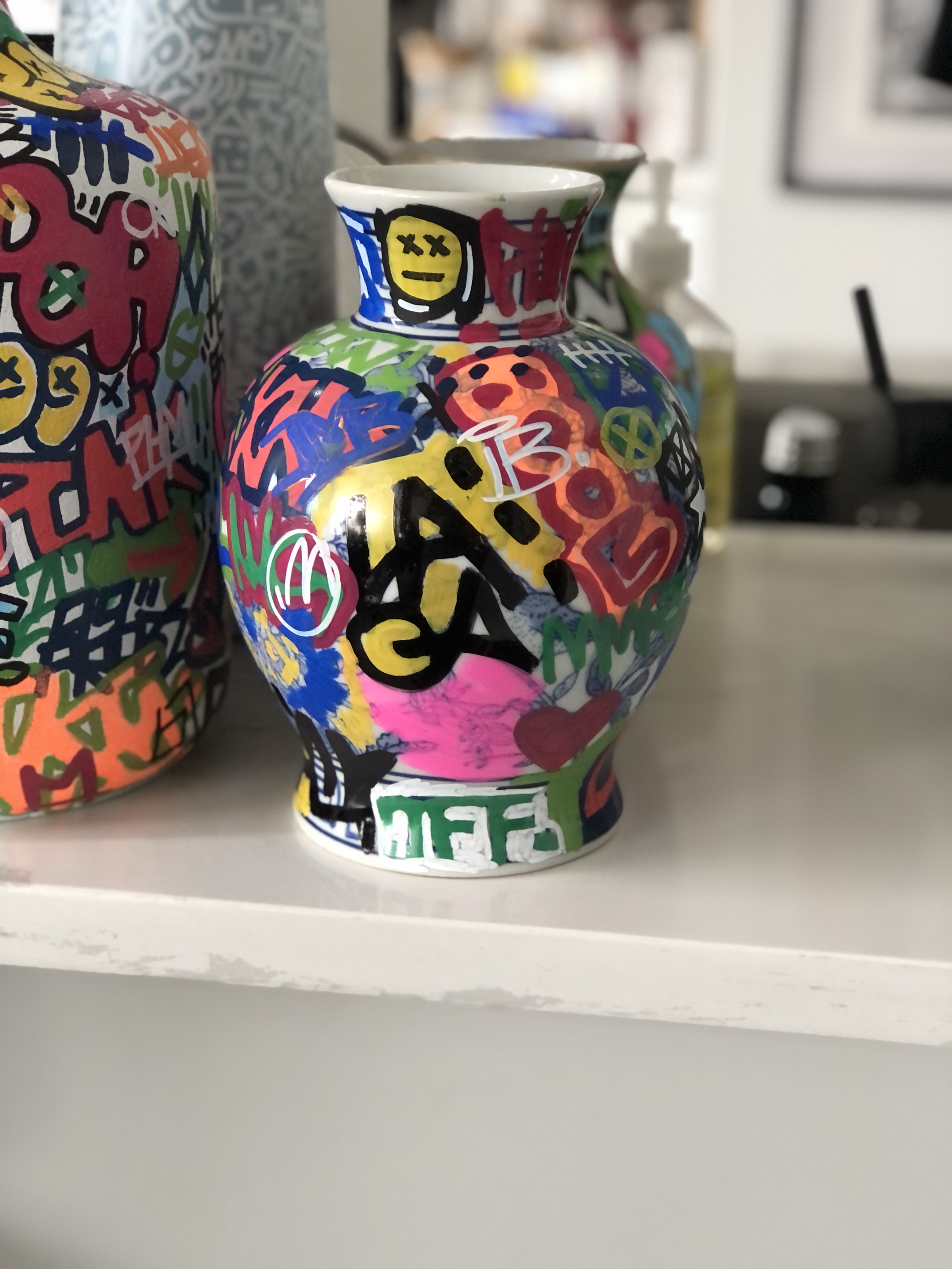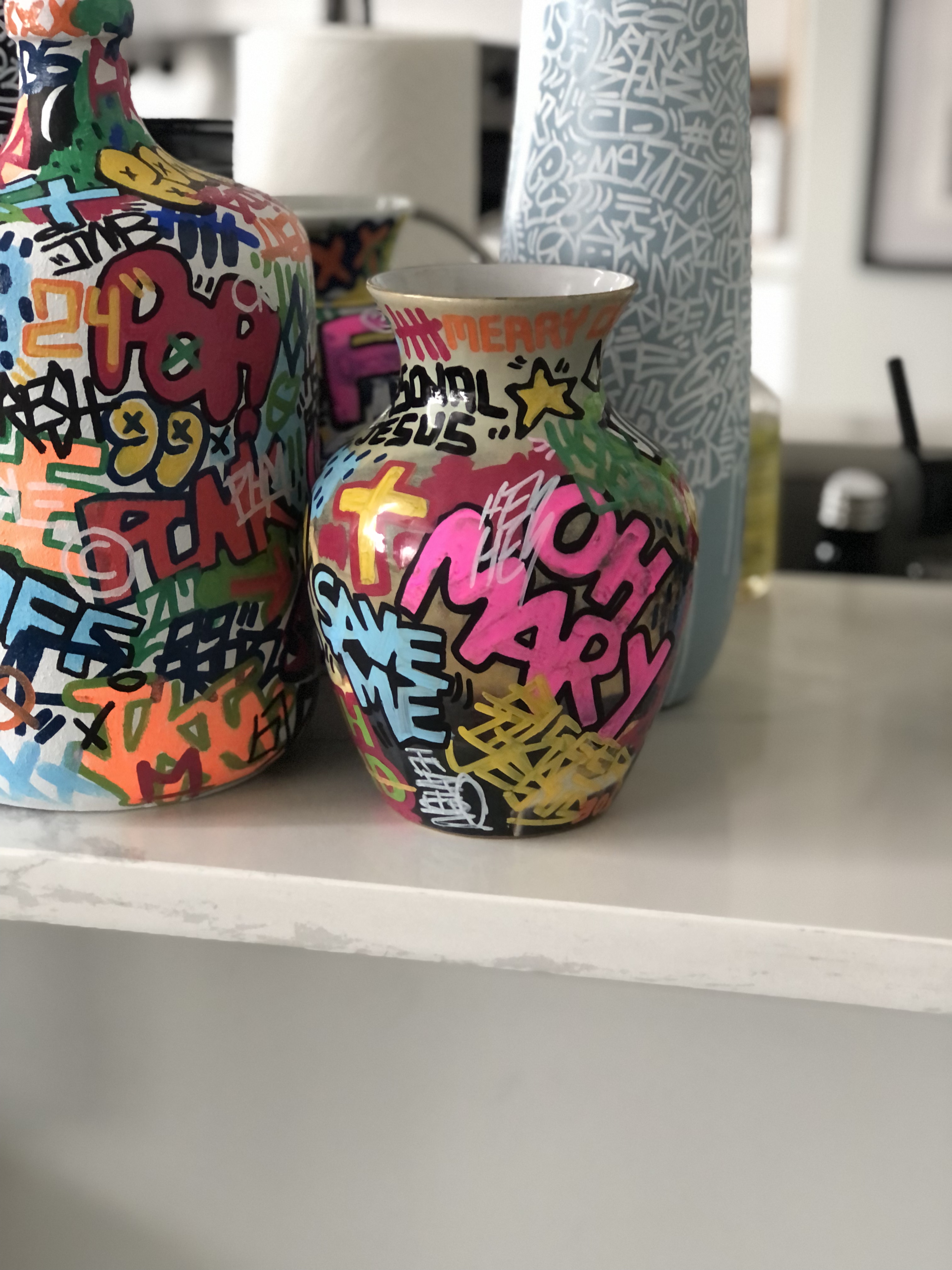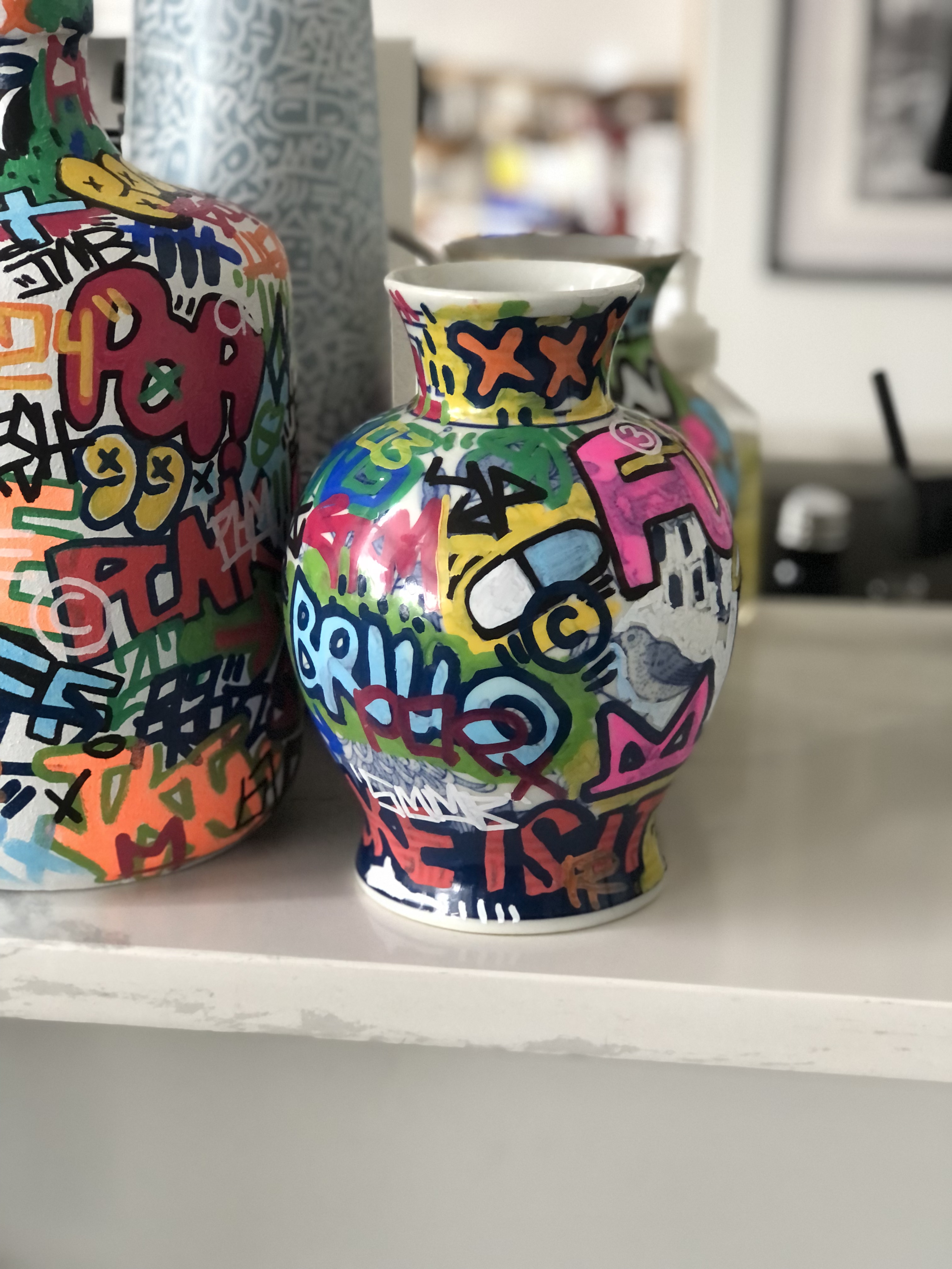 I’m particularly excited about finding and painting antique-style porcelain and ceramic vessels (like the urns and tea pots from China), ones with intricate patterns and even religious iconography. Being able to apply contemporary art on these has been an important part of the series. I hope to showcase more of these in their entirety later this year.