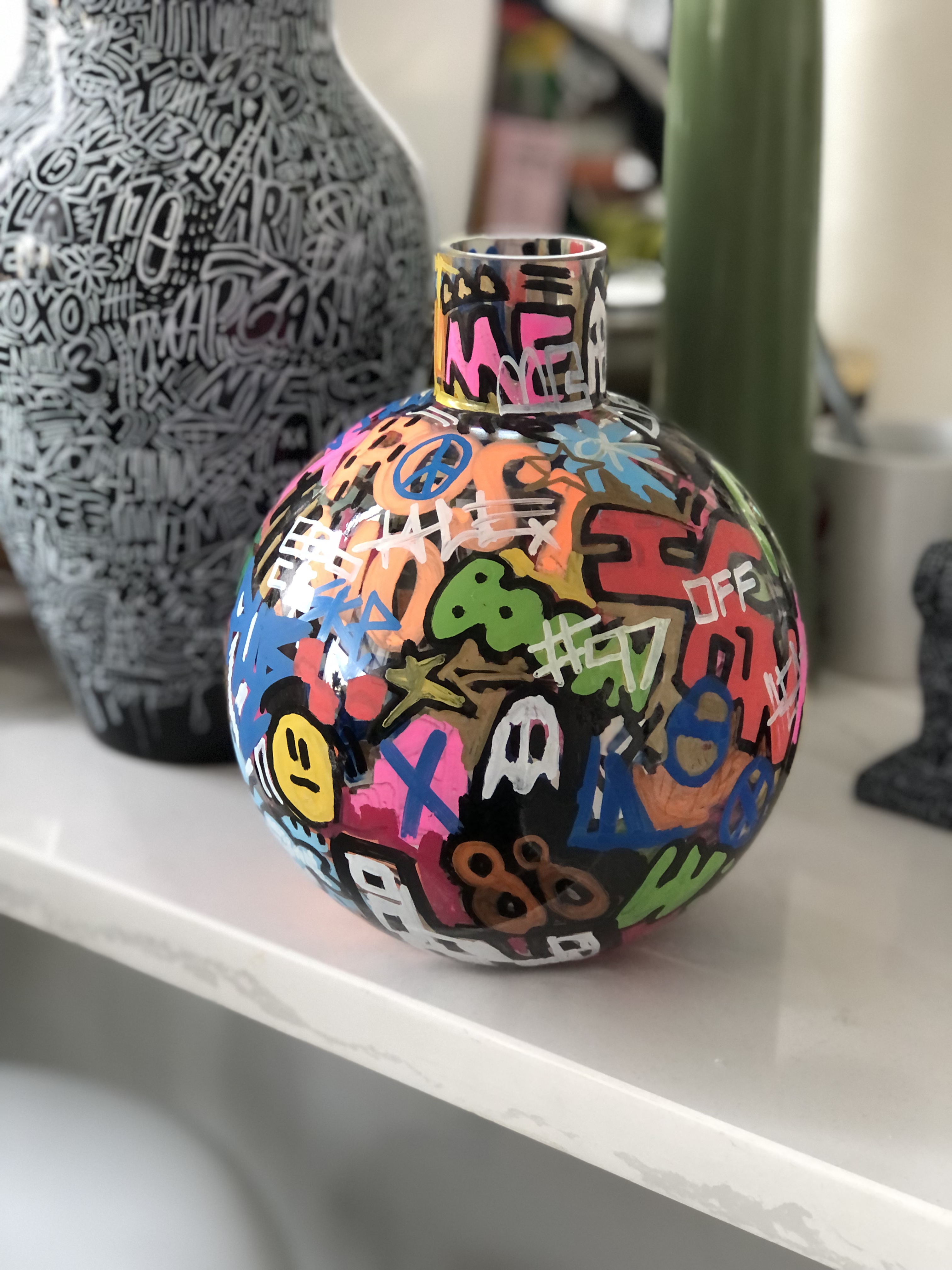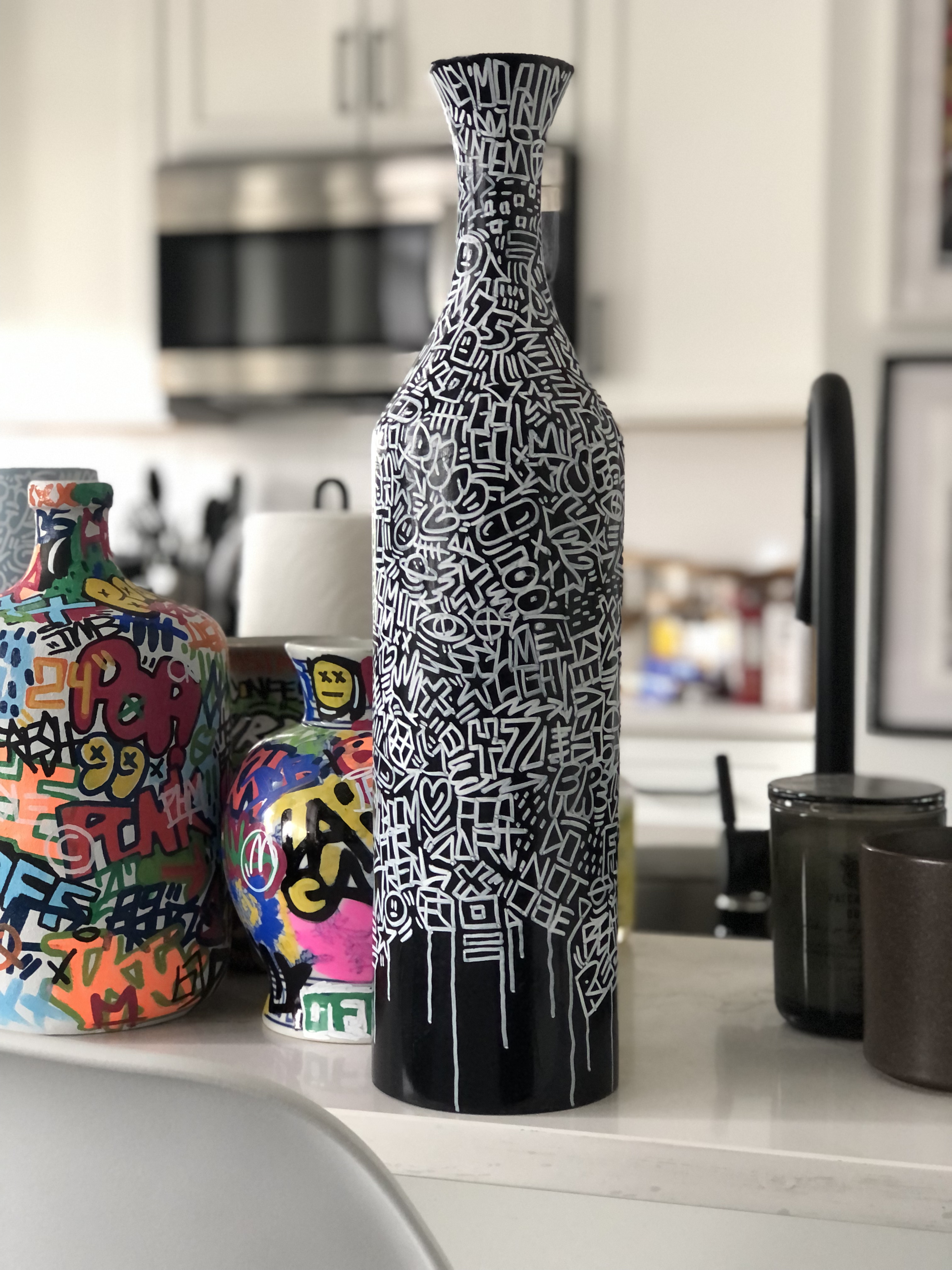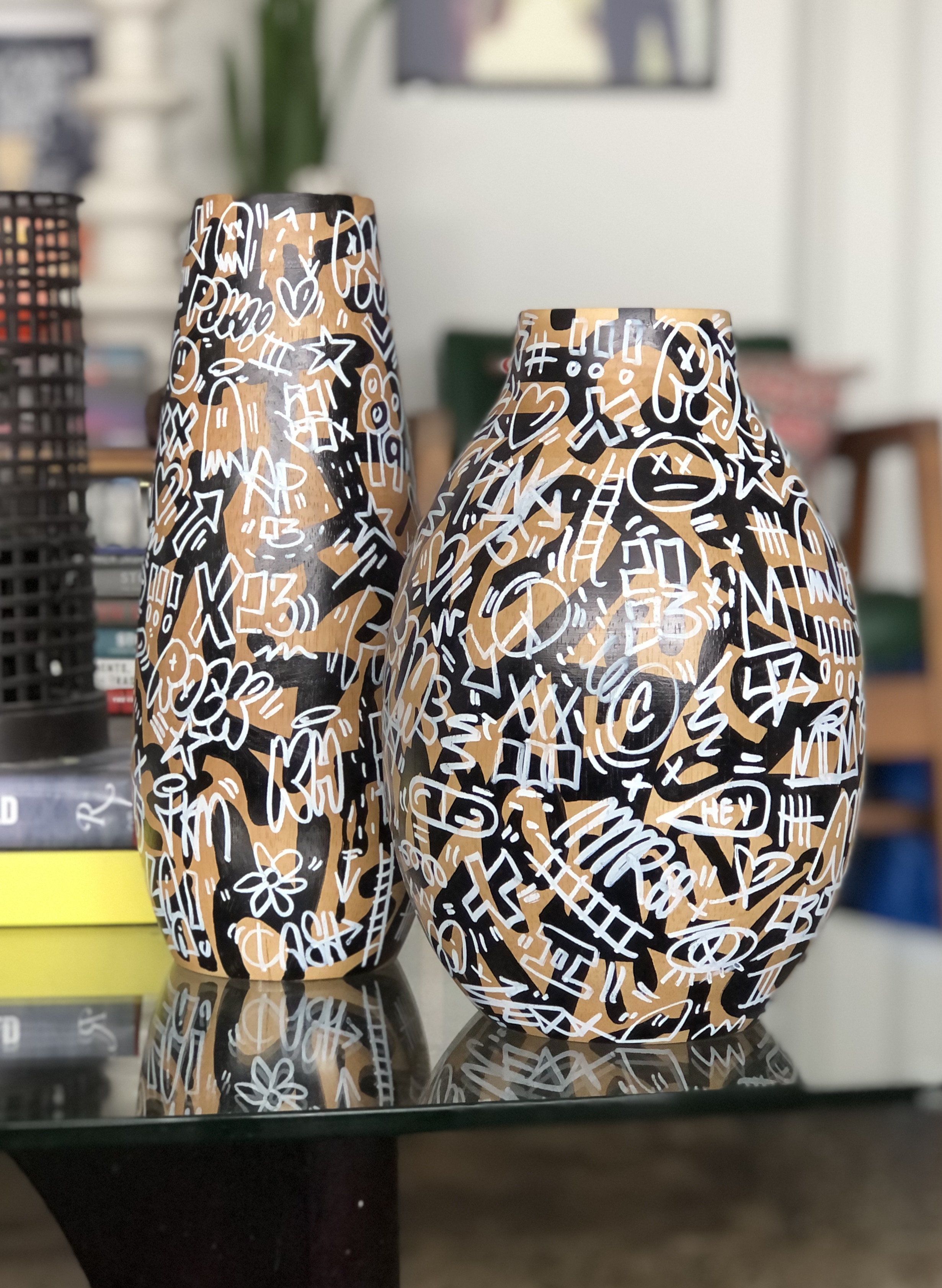 I’m particularly excited about finding and painting antique-style porcelain and ceramic vessels (like the urns and tea pots from China), ones with intricate patterns and even religious iconography. Being able to apply contemporary art on these has been an important part of the series. I hope to showcase more of these in their entirety later this year.
