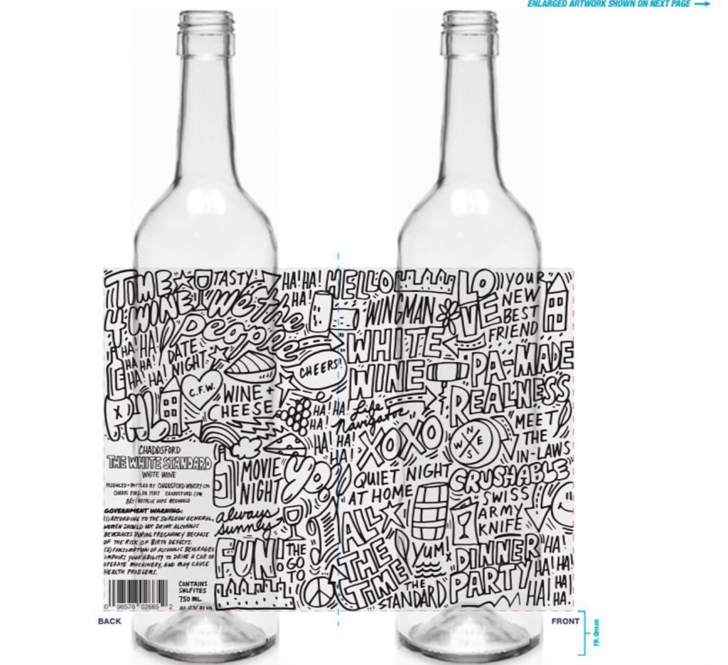 Proud to announce that I am working with Chaddsfiord Winery on some new bottle designs that will be launched this year. The good people at Chaddsford invited me to create two original designs for their red and white bottles. The art will be laser-printed on the bottles directly. I even created all of the text by hand.