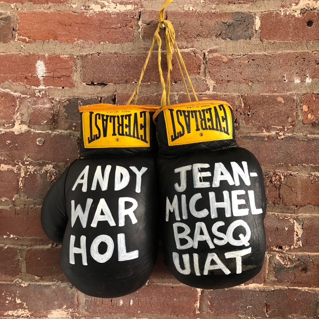 I found these vintage boxing gloves and knew that I wanted to create a memorial to Jean-Michel Basquiat and Andy Warhol, and specifically the photo shoot they did in the 1980s to promote their art exhibition of collaborative works.