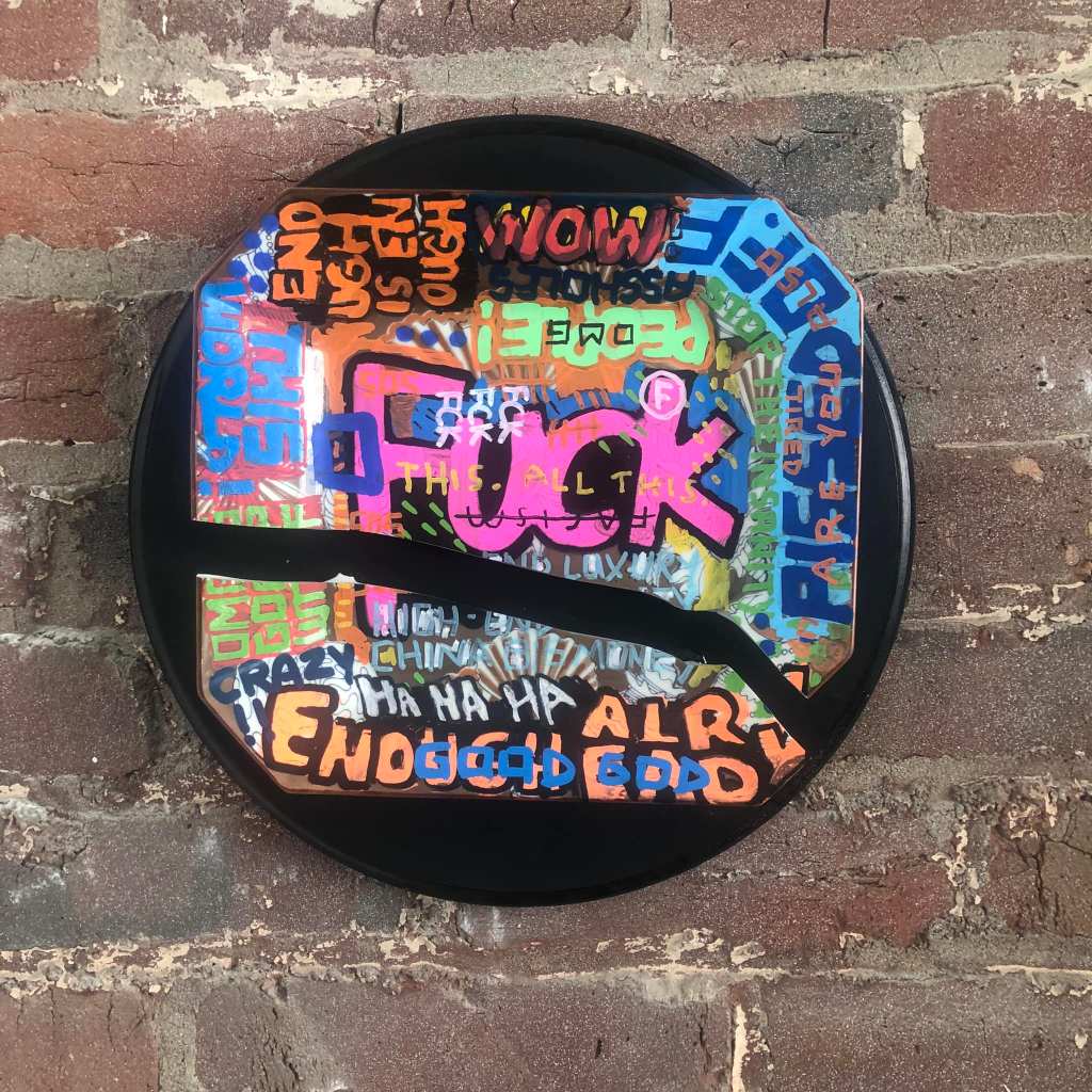 The original FUCK Plate was designed to be intact. But after an accident in my studio, I ended up with two halves of the plate, split in such a way that I decided it should be mounted on wood for the full effect. Fortunately, the collector was thrilled with the new development and purchased the plate even after the break. We both like to think it’s an even better piece now.