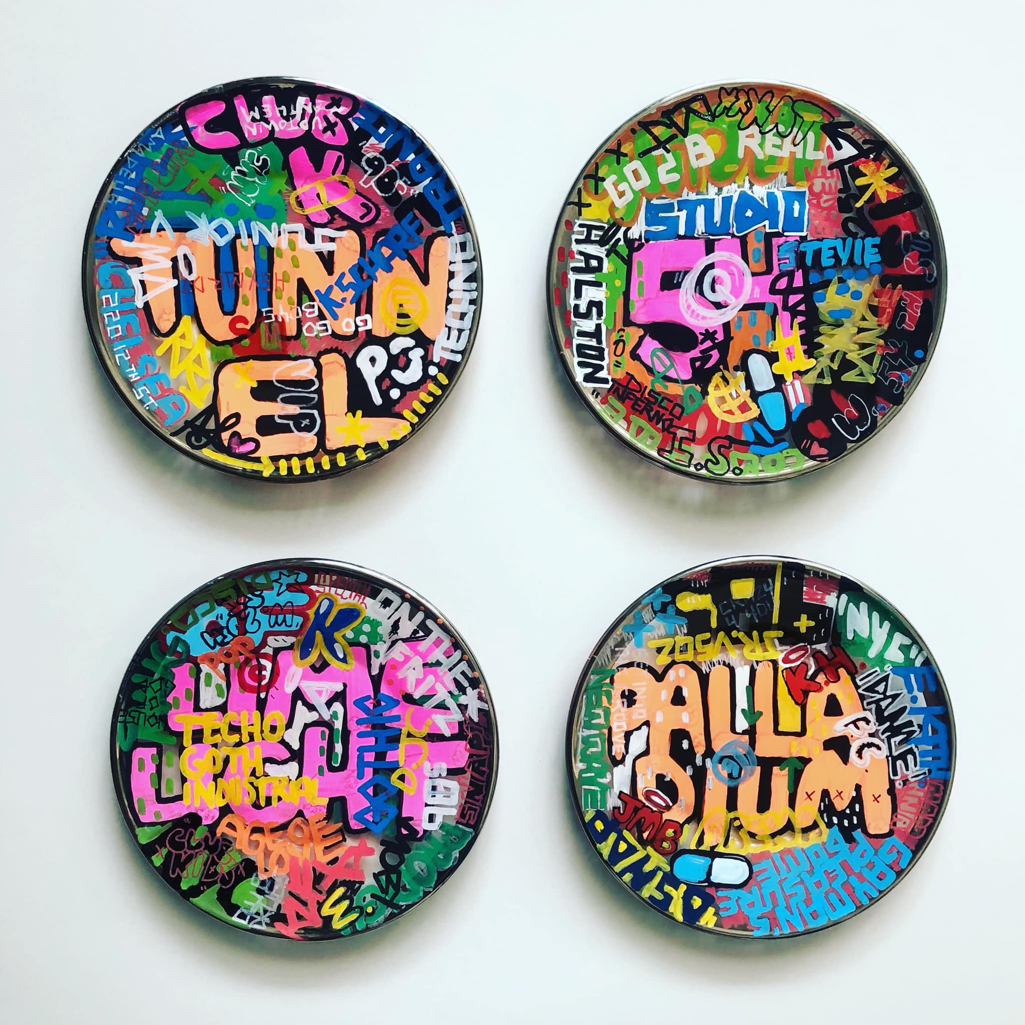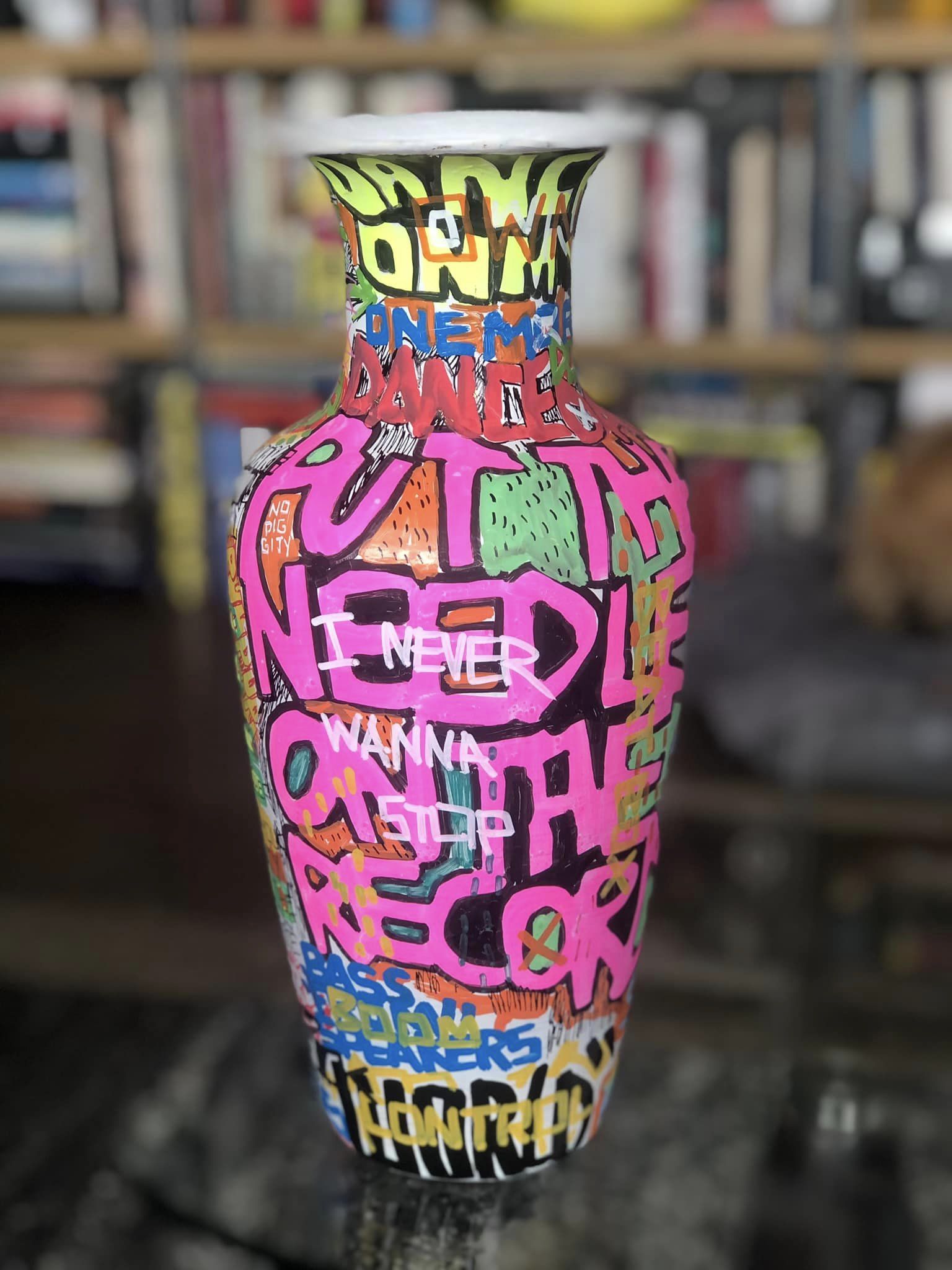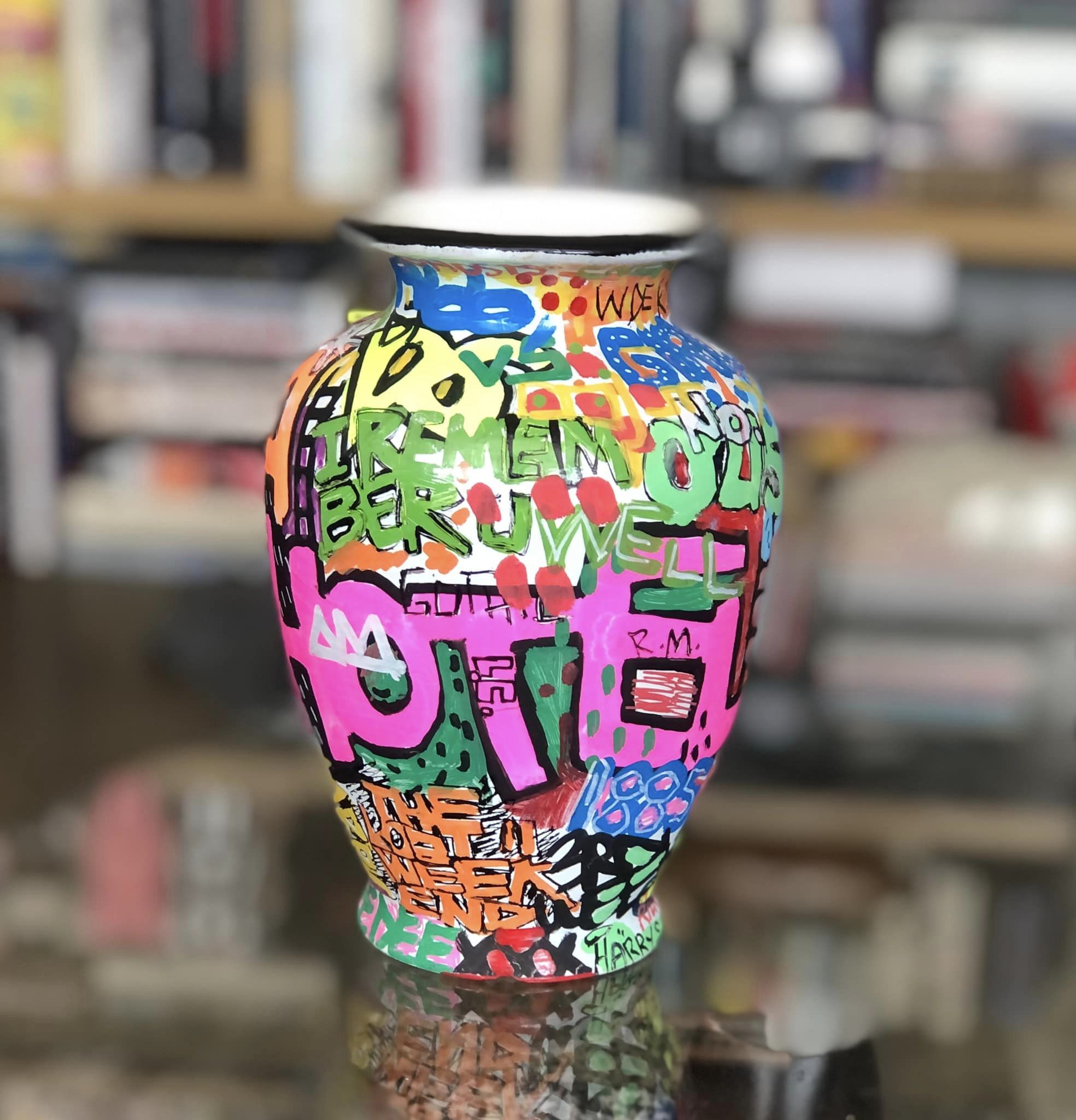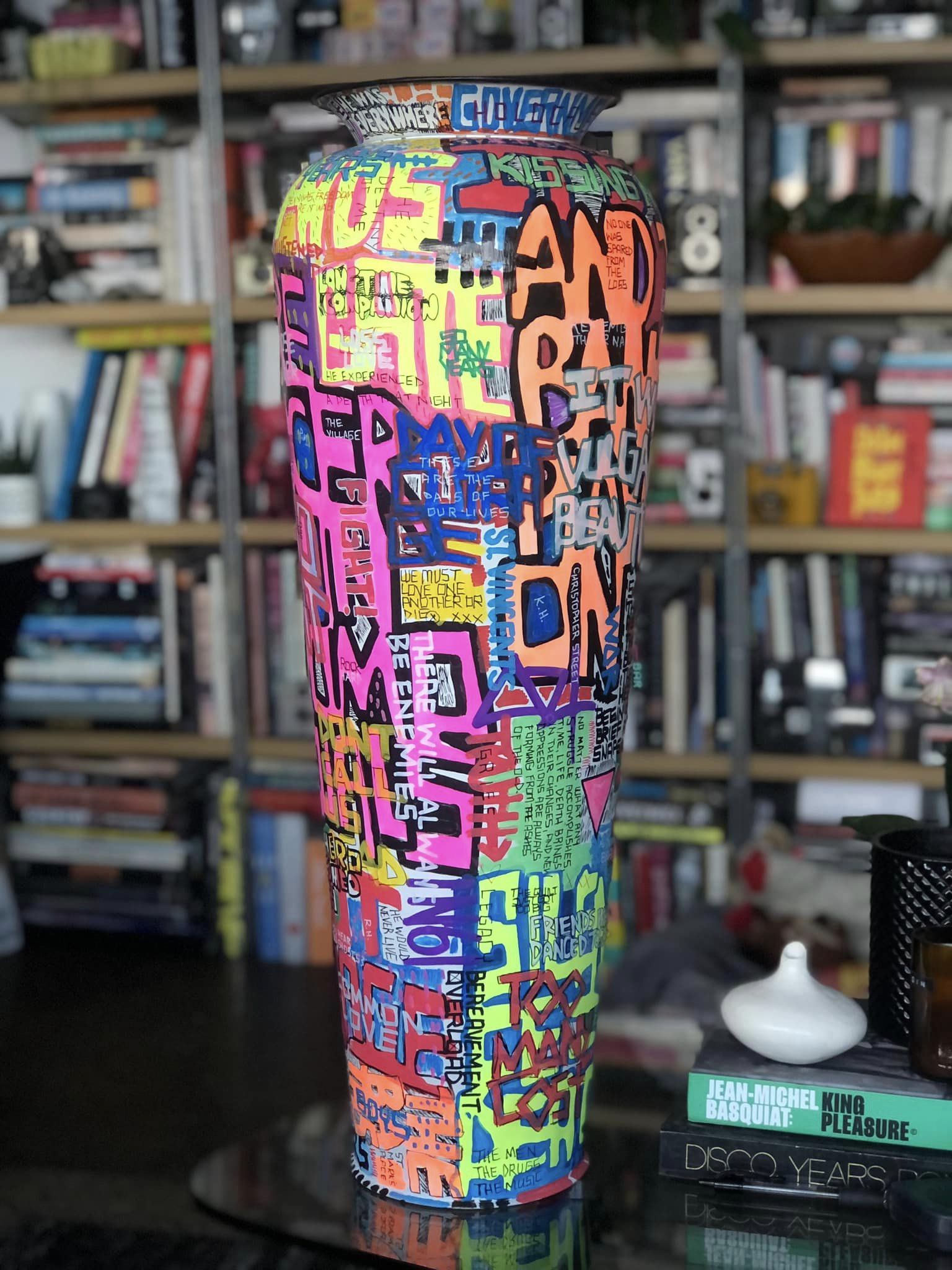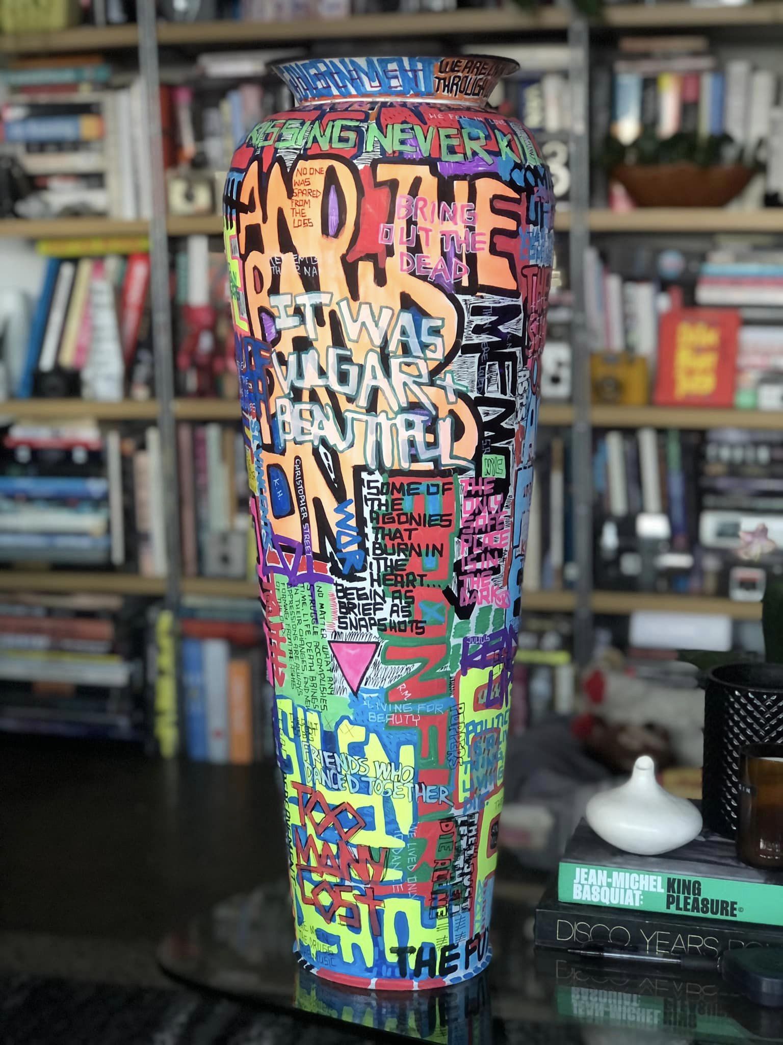 I’m working on a series of paintings and painted objects that memorialize and celebrate gay male culture in the 1970s and 80s, both the liberation and decadence and the shock and grief of the AIDS crisis. These pieces include urns and plates, as well as reclaimed wood planks and slats (references to the piers in NYC and the boardwalks of Fire Island) with references to sex, life, death and celebrity.