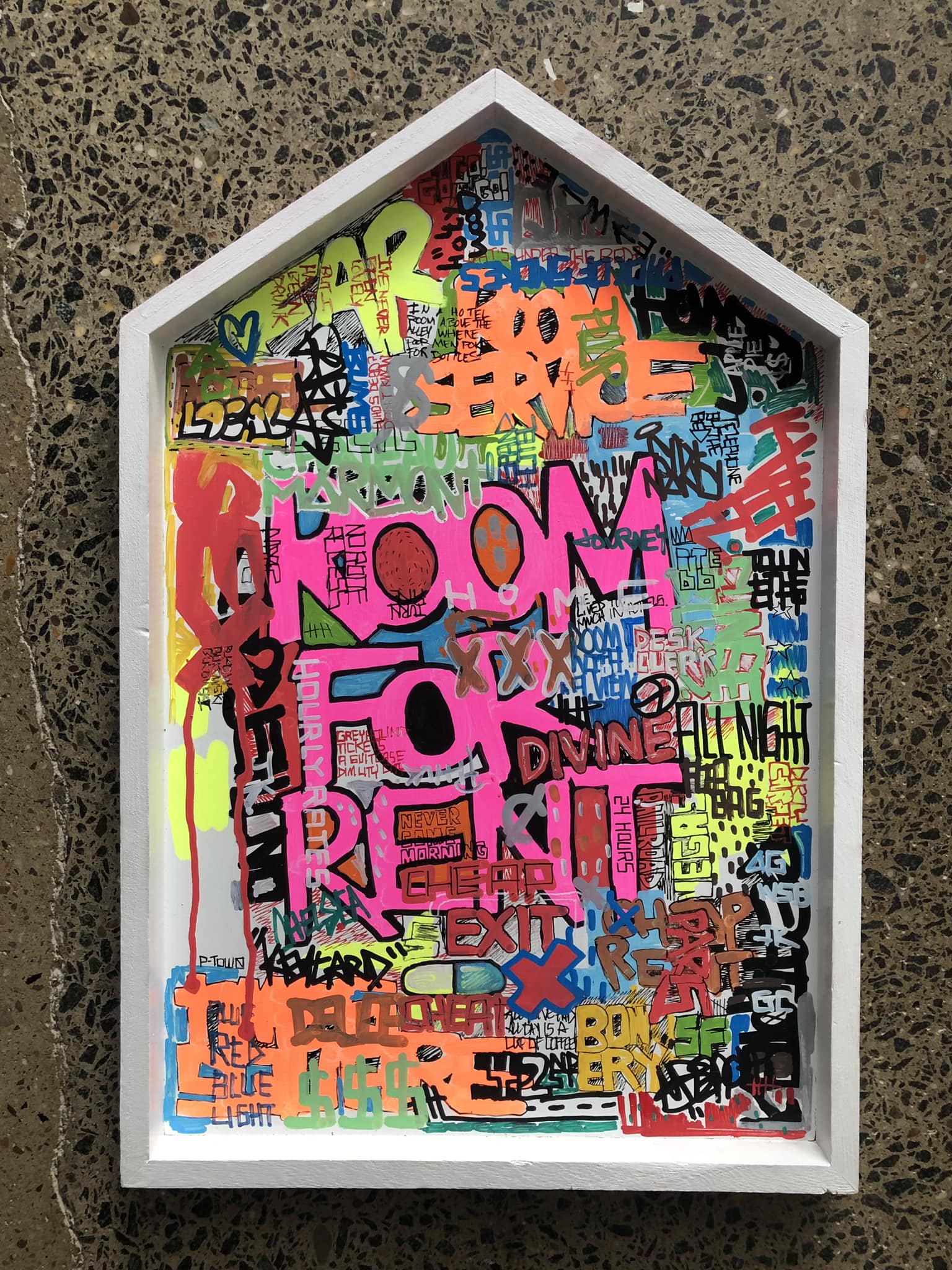 The second, LOW LIFE, celebrates the culture of low-rent motels, famous hotels and flophouses with a nod to poets like Charles Bukowski. I used an old chalkboard in the shape of a house to create the basis for the piece.