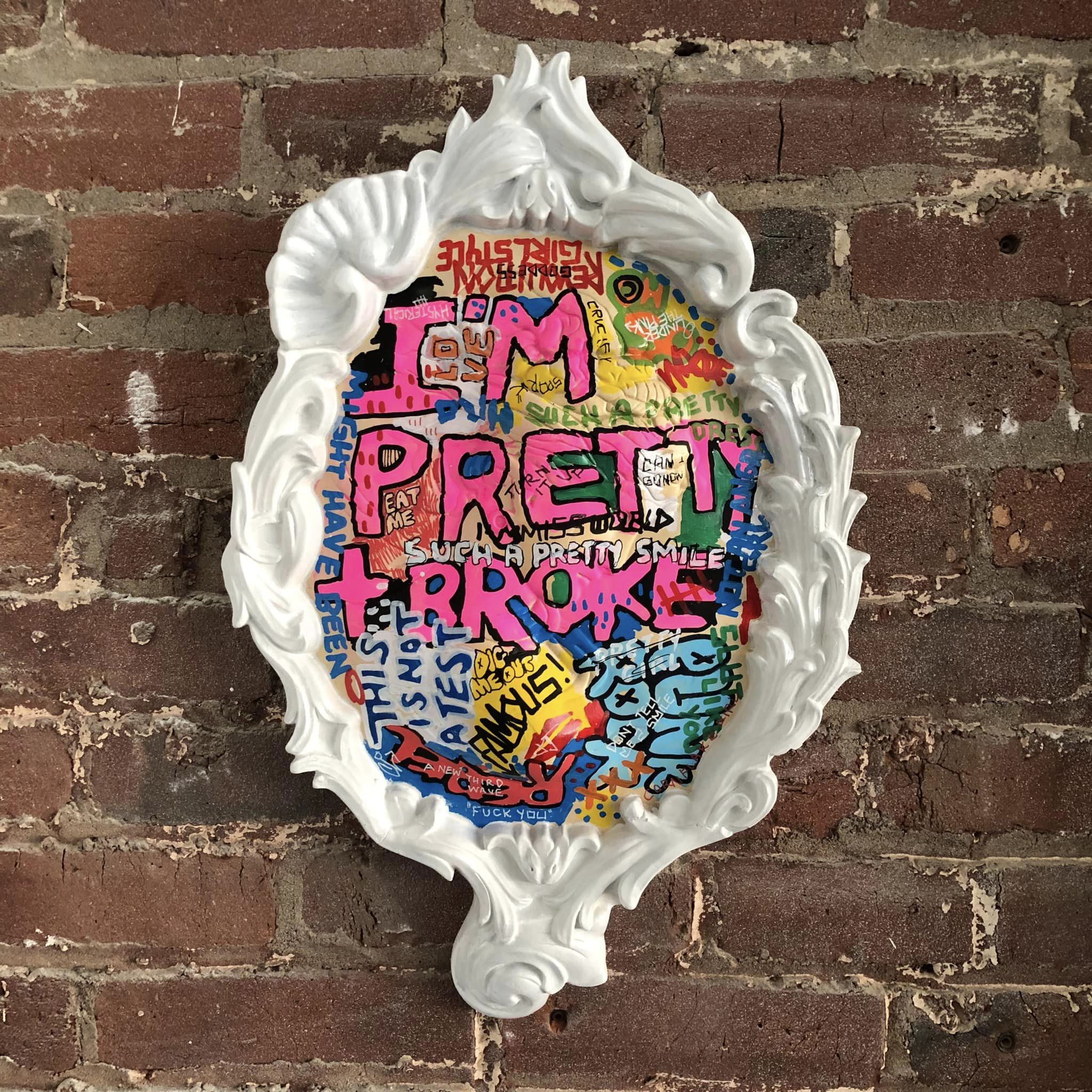 The first, PRETTY + BROKE, is inspired by 90s music – bands like Hole, that exemplified the idea of a trash glamour. I found a decorative 3D bust of a woman within an antique frame that I loved. I knew it would make the perfect backdrop to this thematic panting.