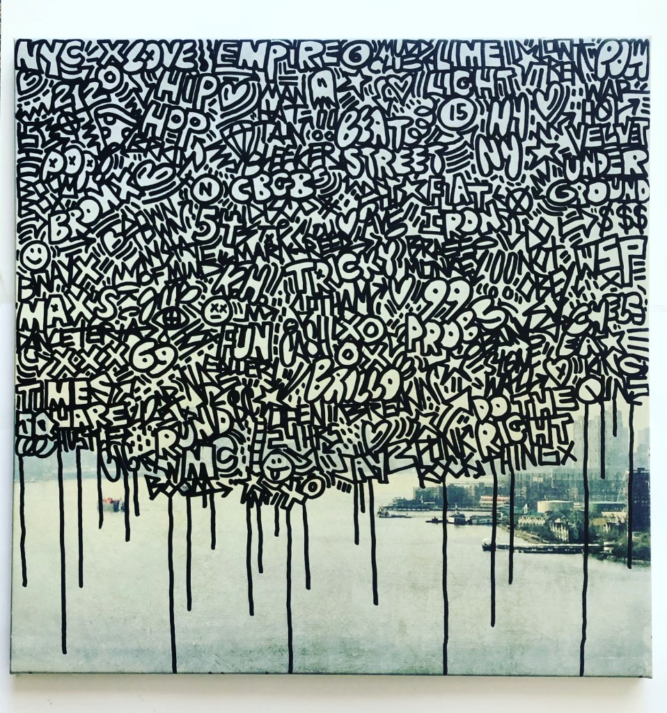 ALPHABET CITY is the first in this series. It’s oil on printed canvas (22×22 inches unframed).