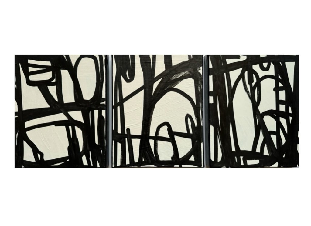 I’m working on a series of black and white paintings inspired by synesthesia, or the way some of us “see” sounds and feelings. These pieces were inspired by Charlie Parker.