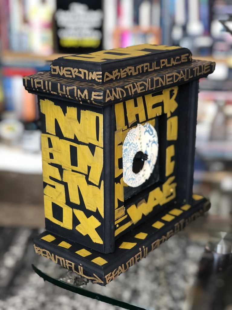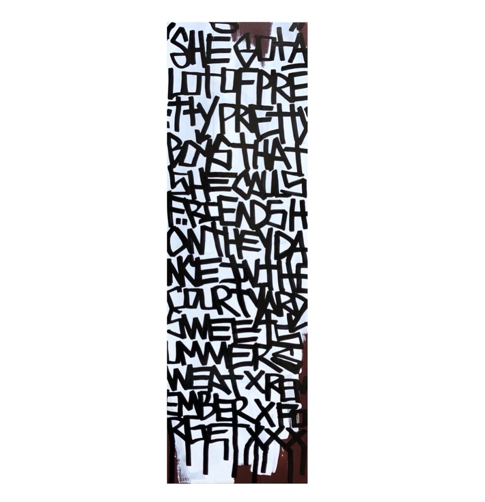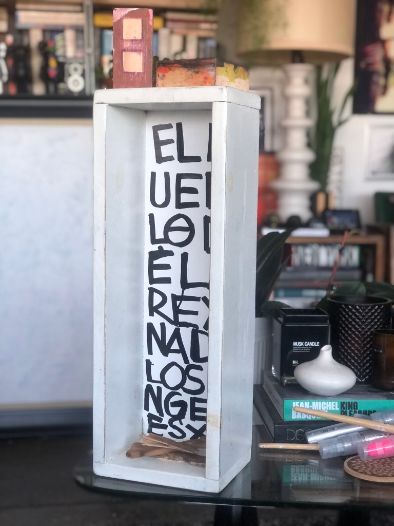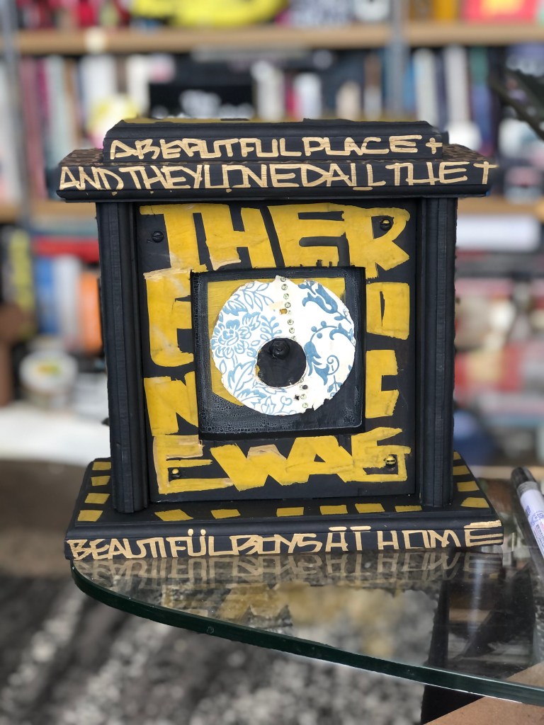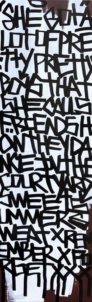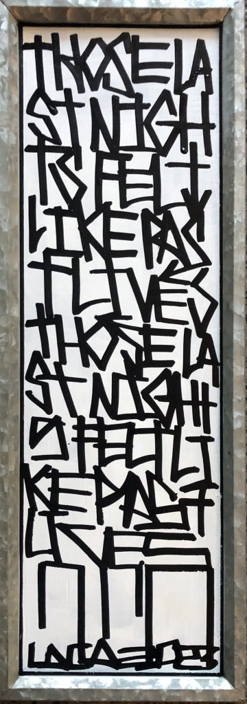 I’m working on more reclaimed wood and other materials, paying homage to poetry and songs. Some pieces feature original text and others celebrate select moments in pop culture history. Here are some samples: