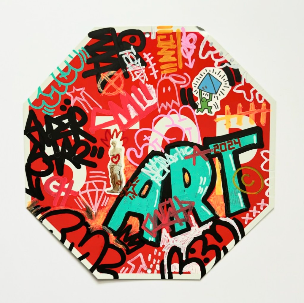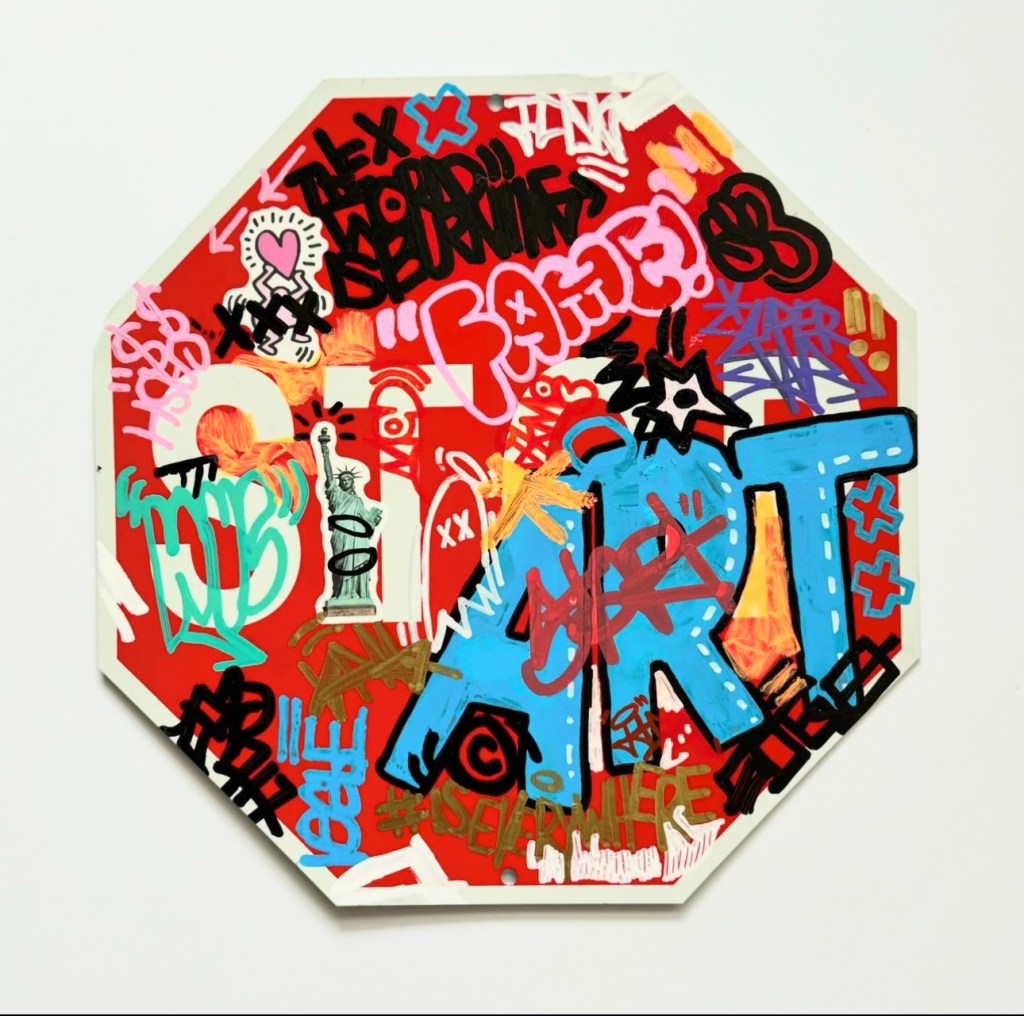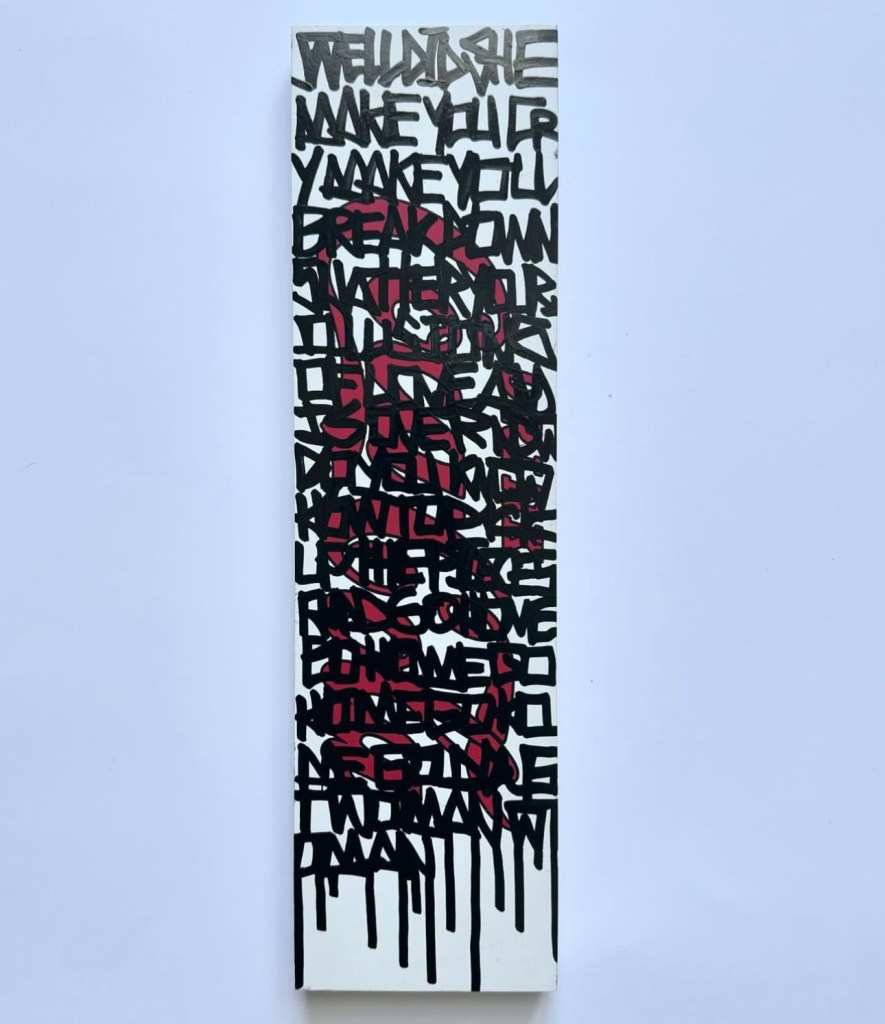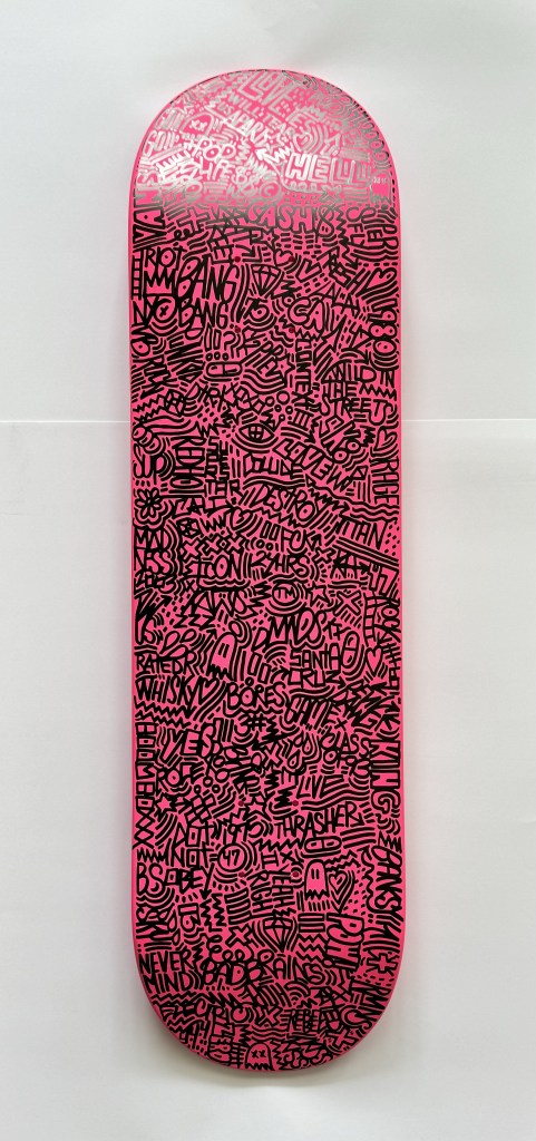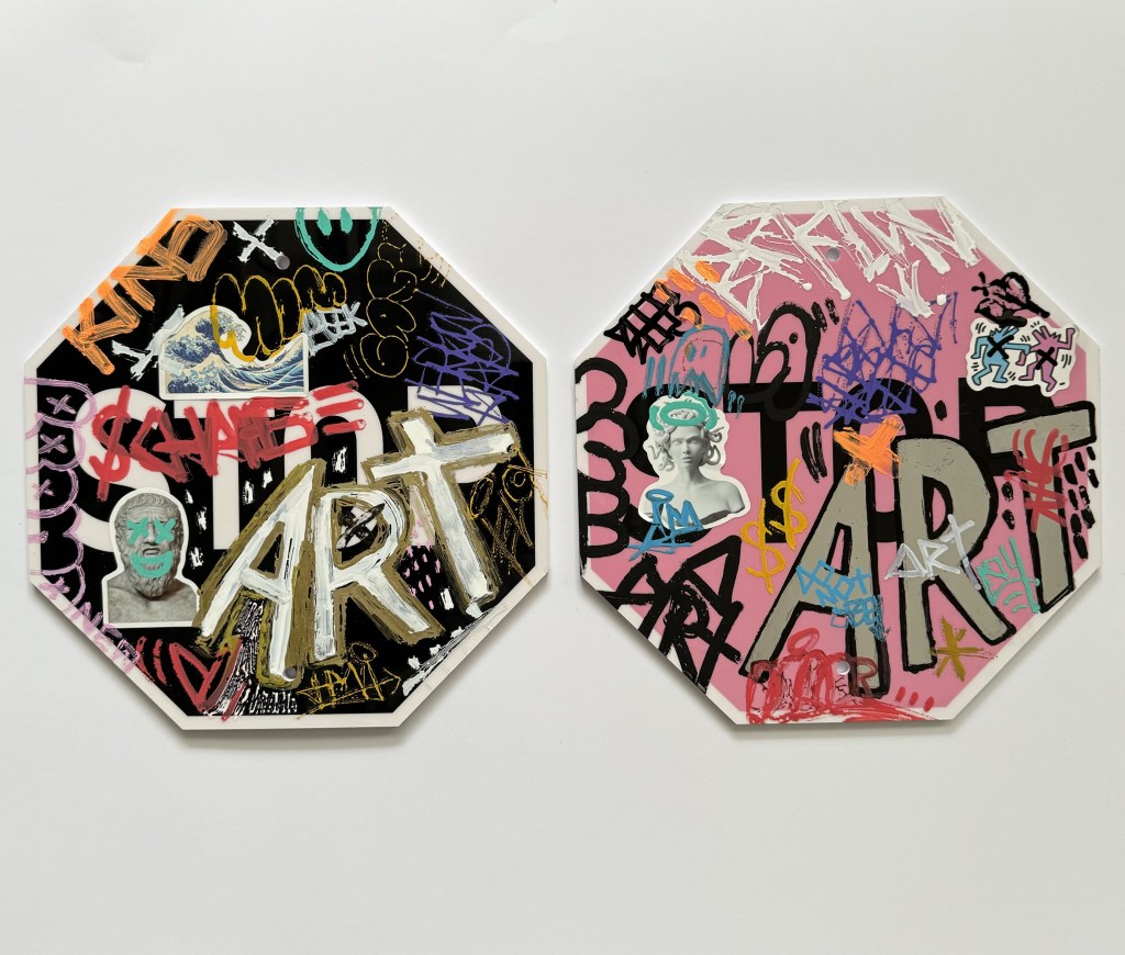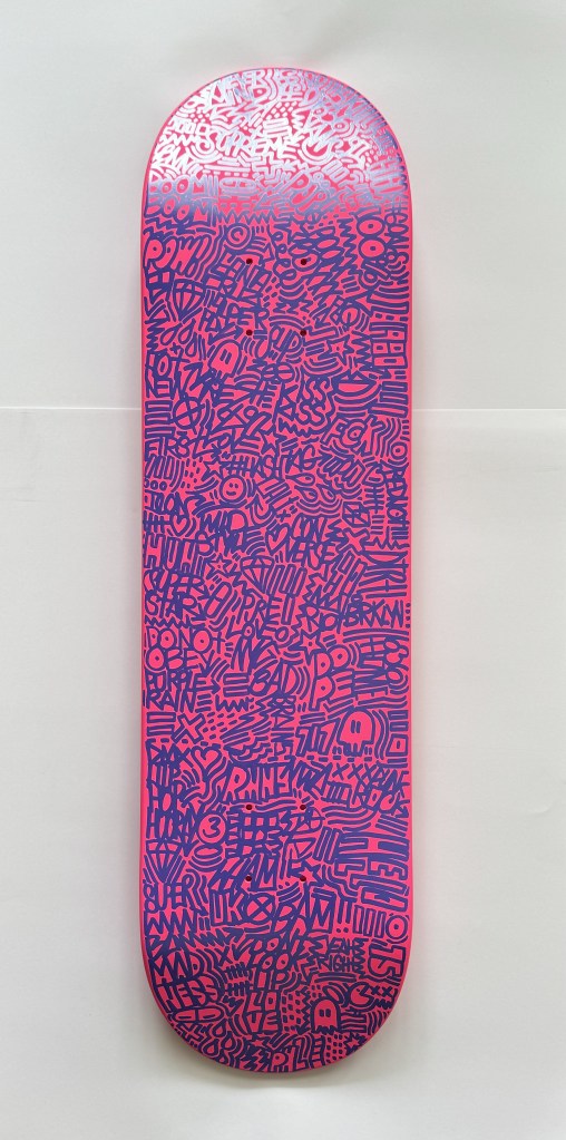 I’m creating art on a range of materials, including reclaimed wood, skate decks, vessels and signs. I love the idea of finding existing materials and making something new in a more sustainable way.