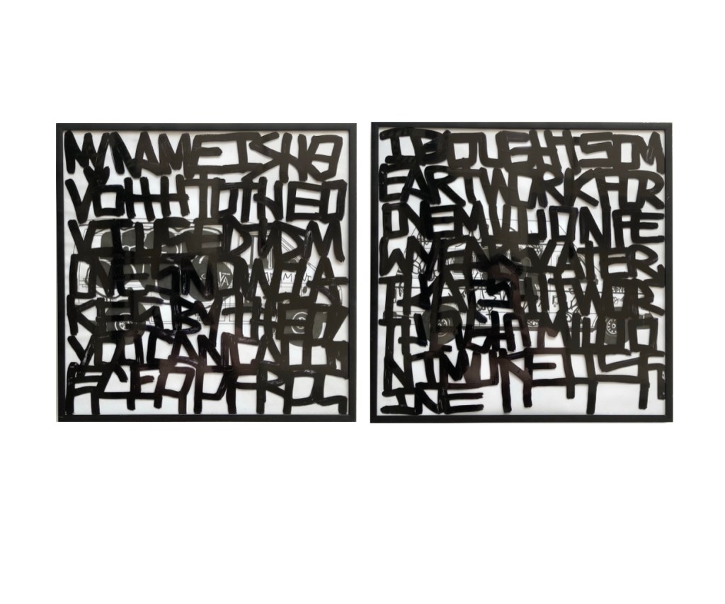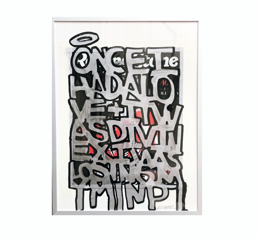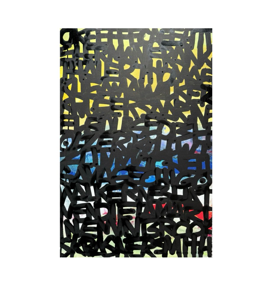 I’ve been experimenting with how words can become abstractions. Many of these works are on paper, canvas, reclaimed materials and signage.
