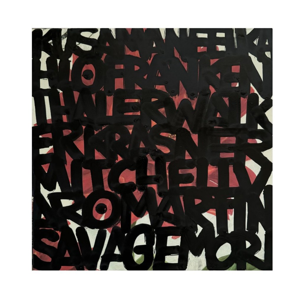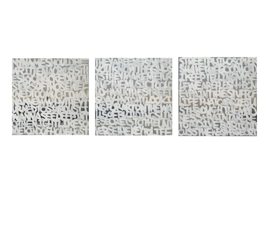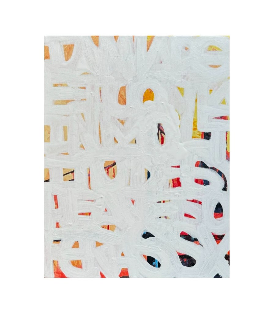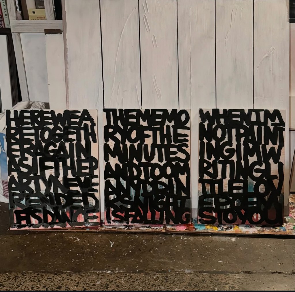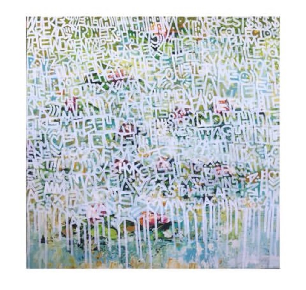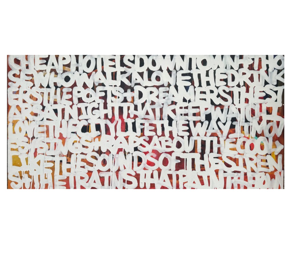 I’ve been working on more abstract word paintings that list names and also poems. I’m interested in exploring how letters and words (even graffiti) can become their own forms of art in paintings on traditional mediums like canvas.